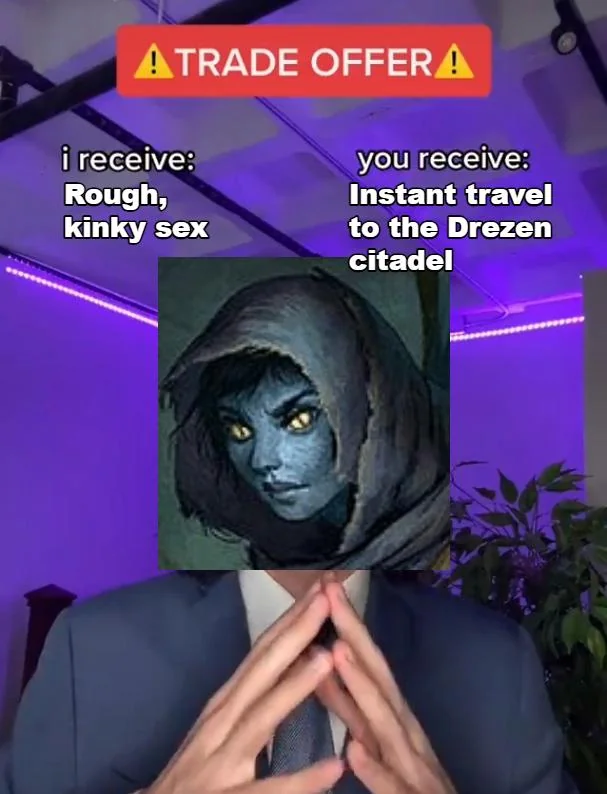 >>543439119It sounds stupid but has taken place according to the lore, rarelyThey probably think it's doing Asuryan's will to redeem a deldar>>543439272Exactly, it would flesh out her character in a neat way rather than leaving it a loose end. And it would fit with her "go your own path" thing.