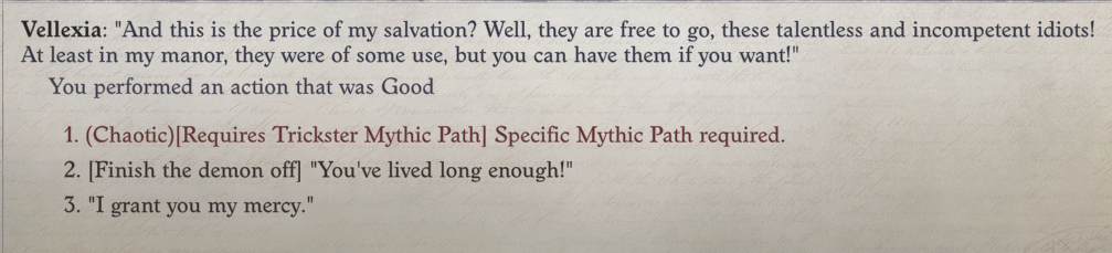 >>543547504Lawful Good Paladin/Cleric multiclass, picked Angel as mythic path until I found out it was a lie, so I gave it up. Didn't realize it meant my companions would no longer get mythic levels so they were all stuck at 8. Chopped of Wendaug's head the second I had a chance, though Lann is mostly boring as fuck. Ran Camila through in the basement the second I saw what she was up to. Didn't kill Stich because he was funny (can you actually kill him?). I was expecting to fight and kill Hulrun, in fact I wanted to, I didn't want to attack him outright, unless he was going to attack me or someone else, but that never happened. I was to fight with and kill Reg, but that never happened (maybe because I gave up the mythic power).Ember and Seelah carried my game, and then I got to add Galfrey too (who I gave fighter multi-class). I wish I got her earlier. I would have loved to have just been smiting every fucking thing left and right with three members after Ember crowd control.