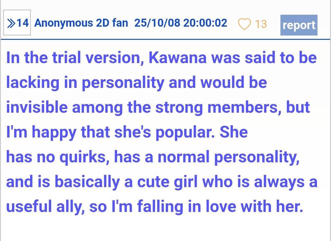 >Kawana>has no quirks>has a normal personality>basically a cute girl>always a useful allyWhat a boring character…