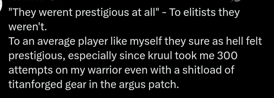 >>543550175>yeah and all of that is bad. all cosmetics should be obtainable.Why? I don't agree with you because I like seeing someone with full T3 (although it's easier to obtain now), challenge mode sets, weapons, artifact appearances or unobtainable mounts. I look at those characters with wonder and wish I played then and got those and the game feels bigger for it. It's one of the last holdouts of the pre-transmog mentality where seeing someone in the capital city with a full set on meant it was from a raid and it was prestigious and you understood that even if you were a pisser at level 5.