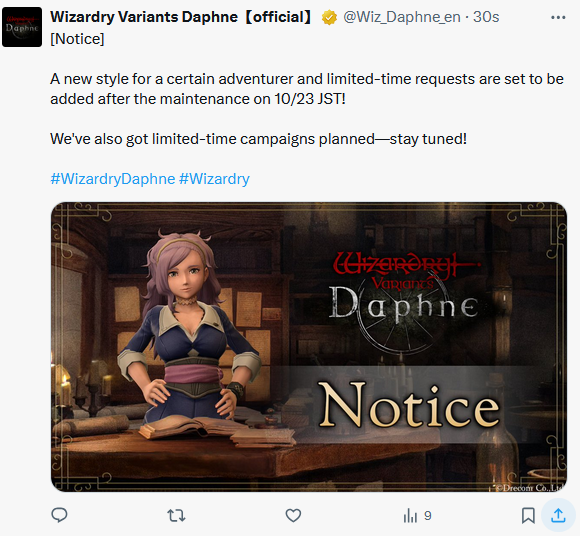 Lazy Warped Ones Edition>Current Featured Adventurer Banners:Yuzunamiki, Pinnacle of the Flower District, - Beastfolk Ninja - Until 11/12A certain Legendary Adventurer, Golden Beast Dancing Maiden - Beastfolk Thief - Until 10/22>Current Reminiscence Adventurer Banners:Livana, Mage-Slaying White Daemon - Legendary Human Fighter - Until 11/05>Wizardry Variants is available on Android and Steam:https://store.steampowered.com/app/2379740/Wizardry_Variants_Daphne/https://play.google.com/store/apps/details?id=jp.co.drecom.wizardry.daphne>Current Events/New Content:[Update] Ancient Mausoleum - New Remains added (Human-Nin)[New Content] Bounty Bills - Complete Abyss 2 at least once in its entirety (Do not need true ending).[Anniversary] Kingdom Dawn Festival Celebration - Until 11/12[Anniversary] Kingdom Dawn Festival Supplies - Two Guaranteed Legendary Adventurers (Up to Alt Debra) - Until 11/12[Anniversary] Bone Picker Returns! - (Abenius, Gerard, Aldric, Red Beard, Alt Adam) - Until 11/12[Mission] The Fleeting, Sweet Trap - Until 10/28[Dispatch] Fortress Basement Sanitation - Until 10/23[Mission] Archive of Guidance IV - Until 10/22FREE 800 Gems of Org (one time) + 50 per week on their official web currency store: store.wizardry.infoANOTHER FREE 800 Gems of Org (one time) + 50 per week on their new official web currency store: webstore.wizardry.info/product>Fanguides:https://wizardry.fasterthoughts.io/ - (EN)https://gamerch.com/wizardry-daphne/ - (JP)>General Information:https://rentry.org/x5xxitrz>Tavern/Camp choices:https://rentry.org/2gngvv2n>Friend Code:https://rentry.org/SavoryRisk>I.V checker and Other Stat Calculators:https://wizardry-daphne.mcwild.net/init_status/Previous: >>543348747