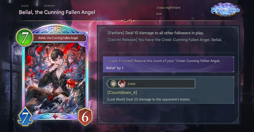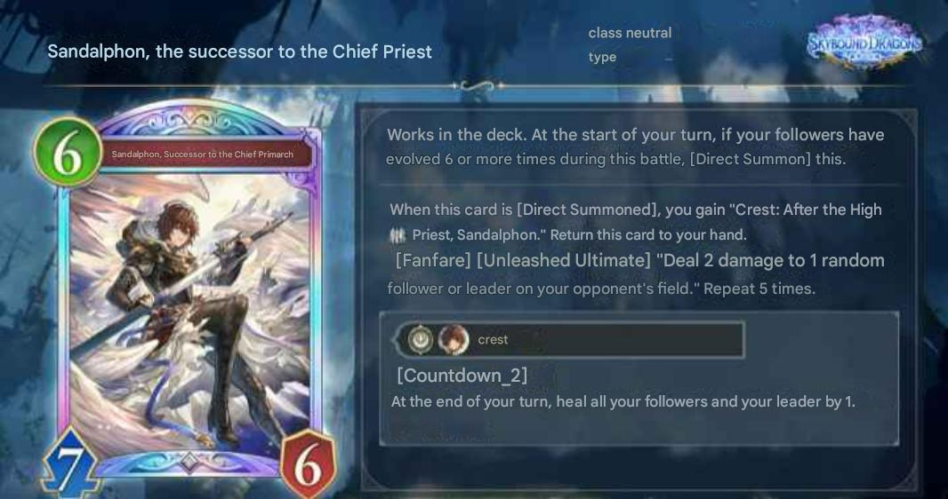 Works while in your deck.At the start of your turn, if the number of times your followers have evolved this battle is 6 or more, [Invoke] this card.When this is [Invoked], you gain “Crest: Heir to the Archangel, Sandalphon.”Return this card to your hand.[Fanfare] [Liberation Oath]:Deal 2 damage to a random enemy follower or the enemy leader 5 times.Crest[Countdown (2)]:At the end of your turn, restore 1 defense to all your followers and your leader.