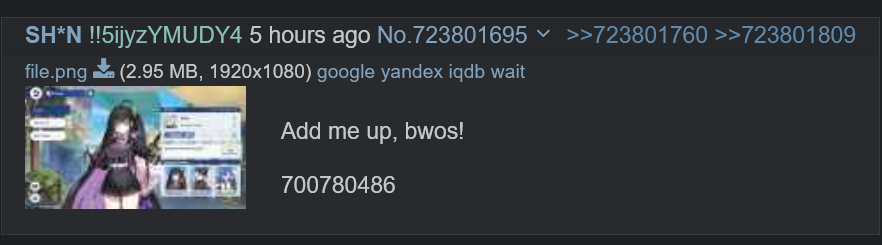 >>543548101>posting teams that are that steady with no changes while there aren't enough other gameplay posts that could plausibly be confused as yours in threadsIf the team and thread situation makes it that identifiable, then you don't even need the kohaku part of this and you can, if a stalker is willing to, be accused of being the same person across threads regardless of IDs or not. people already go to lengths to hide unique identifiers like in game IDs or names. That's on you regardless of 4chan IDs.If you add the kohaku part then its still on them because they only go identified their own posting and image habits. Up to them to deal with stalkers by getting smarter about how they post their gameplay now if they want to post "your waifu a shit"