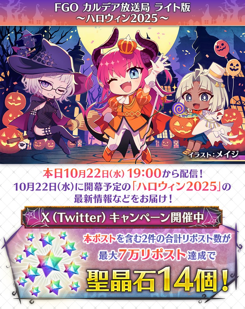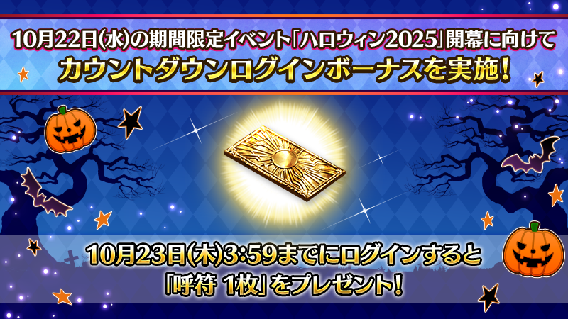Previous: >>543285140>CBS Halloween 2025:●Wednesday October 22, 19:00 JST.▶Cast: Rumi Okubo (Elizabeth Báthory), Ayako Kawasumi (Artoria Pendragon).▶RT Campaign: 14 SQ.https://www.youtube.com/watch?v=glMCX7Y0DNw>Halloween 2025 pre-campaign:●October 17~31 JST.▶Requirement: Fuyuki.▶Login Bonus: 3 SQ and 1 Summon ticket.▶Mystic Code Halloween Royalty added to the Da Vinci Shop.▶Bonus Servants:-Chances of getting a Great/Super Success when strengthening will be doubled.-AP consumption for Interludes/Strengthening will be halved.-20% Bond Bonus when completing a quest.https://news.fate-go.jp/2025/halloween2025_cp/>Grand Duel Assassin:●October 15~22 JST.▶Requirements: Clearing OC prologue.▶Login Bonus: 7 Golden Apples.▶Assassin materials ticket added to daily mission rewards (~October 18).▶Limited Master missions: 3 SQ and 18 Stargazer's Teapots.▶Permanent Master missions: 1 Torch of Polar Star, 1 Torch of Morning Star, 1 Torch of Nova, 1000 Stellar Sand,6 5*Fou-kun (3ATK, 3HP) and 50 Assassin Beast's Footprints.▶Permanent Master missions for unlocking and strengthening Grand Assassin: 18 SQ, 7 Grail Tears, 2 5*Fou-kun (1ATK, 1HP),2 4*Fou-kun (1ATK, 1HP), 20 Hellfire of Wisdom plus Assassin ascension materials and skill gems.▶Assassin class Servants:-Double the EXP when strengthening.-Chances of getting a Great/Super Success will be tripled.▶AP consumption for Ember Gathering Quests will be halved.▶AP consuption for Assassin Training Field will be halved.▶Stormpods quests they will have their AP consumption halved.https://news.fate-go.jp/2025/grand_assassin/>Grand Duel Assassin PU summon:●October 4~22 JST.▶Check each PU in the link below.https://news.fate-go.jp/2025/2025_assassin_pu/>33M Downloads Campaign:●October 8~22 JST.▶See OP >>541916046>/fgog/ Friendlist form (2025):https://forms.gle/WK4dwSC6Mn2WQfZu8>Utility links:https://pastebin.com/iaWmXAq7