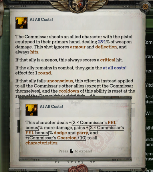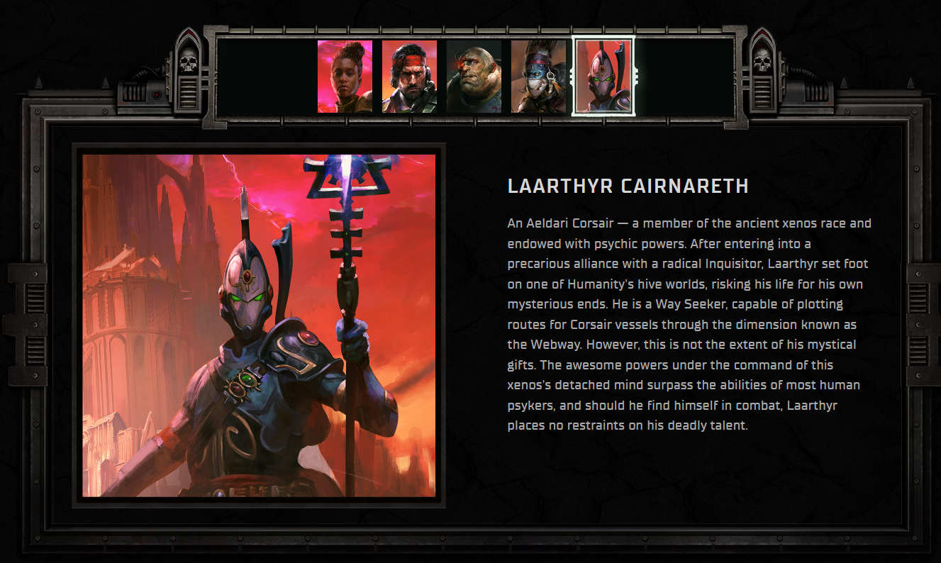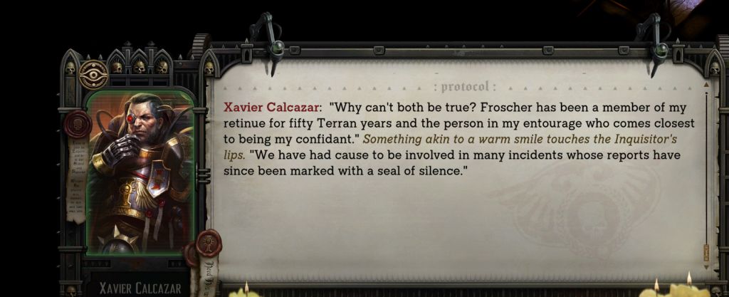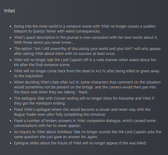 >>543560596This should happen if you give Yrliet to Jimmy>Abandoned by the elantach to the custody of Heinrix van Calox, Yrliet was subjected to a most thorough interrogation.>Van Calox determined that this xenos could best be exploited as his personal assistant and advisor under strict supervision.>They proved to be an effective team, destroying many enemies of humanity and uncovering many useful xenos relics.>Over the years, he came to trust and rely on her, and she on him.>When Van Calox, now Lord Inquisitor, departed the Koronus Expanse for parts unknown, it was his faithful Yrliet who accompanied him.
