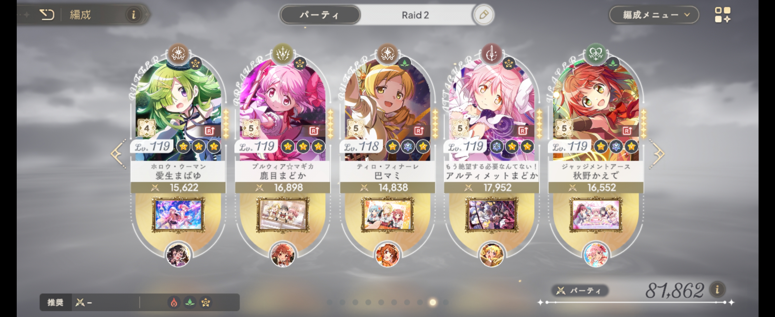>>544183461do you have Momoko, Kyoko, or Madokami? Oriko's abilities focus on groups of enemies and she does less damage to single target.A1 Mami isn't doing a lot for you because you're missing the speed aura from her A2. It might be better to pick up A5 Sana and benefit from her barrier's crit bonus.