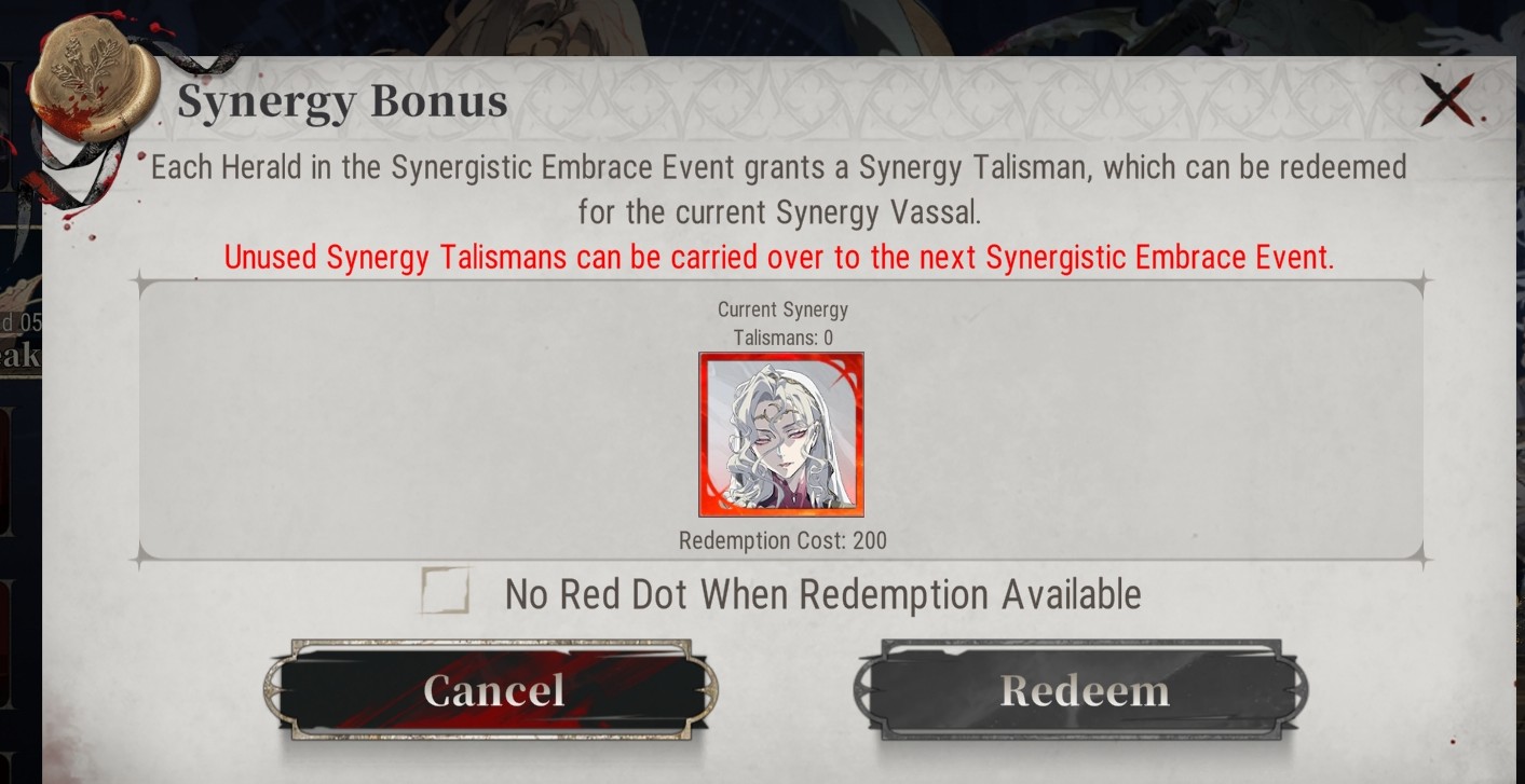 (1) Each Herald attempt in this event returns 1 [Synergy Talisman]. Lords can redeem [Synergy Talisman x200] for the Synergy Reward: SSR Ancestral Vassal Seth.