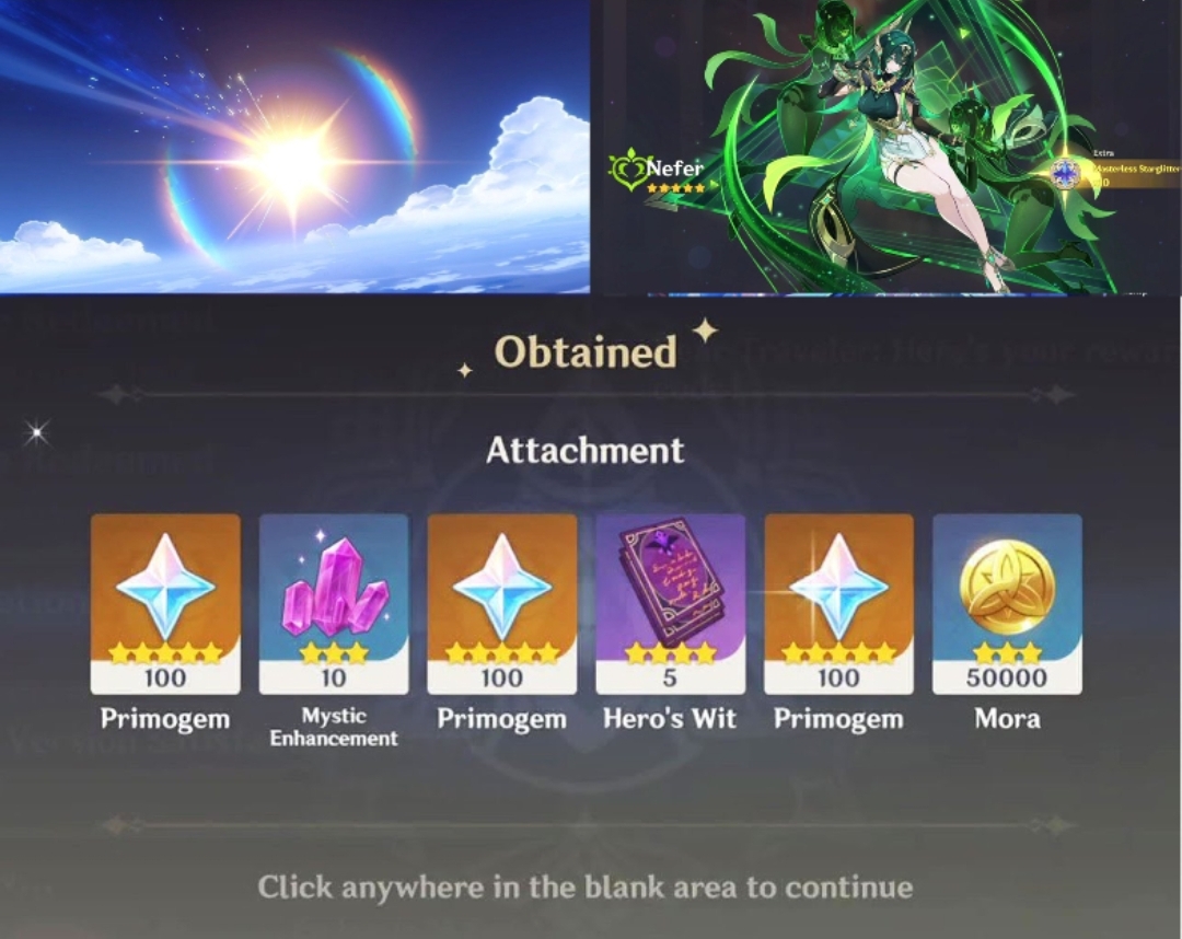 Previous: >>543581808>Character Trailer - "Nefer: Shadowbearing Serpent"https://youtu.be/jcFd1qbRg_I (EN)https://youtu.be/hDktaZmrzn4 (JP)>Character Teaser - "Nefer: An Inevitable Inconsistency"https://youtu.be/egKU8L59cCQ (EN)https://youtu.be/ohV402u_eGE (JP)>Character Anecdote - "The Gem Scam"https://youtu.be/46q9MNa50Yo>Miliastra Wonderland: Version "Luna II" Legendary Set Trailerhttps://youtu.be/nZA0vvO6EbU>Version "Luna II" "An Elegy For Faded Moonlight" Trailerhttps://youtu.be/w50jW_iEXns (EN)https://youtu.be/x-8hTneUDlY (JP)>5th Anniversary Theme Song: "The Long Way Home"https://youtu.be/OvHwco4OxDo>Current character banner: Flins, Yelan, Aino, Sucrose, Dori>Current weapon banner: Blood-Soaked Ruins (Polearm), Aqua Simulacra (Bow)https://www.hoyolab.com/article/41345237>Daily check-in rewards (permanent)https://webstatic-sea.mihoyo.com/ys/event/signin-sea/index.html?act_id=e202102251931481&lang=en-us>Redeemable Codes with Primogems (all regions): https://genshin.mihoyo.com/en/gift0FQBAJNXCUFU (NEW)GENSHINGIFTEPIC2025R4SCAU7CR1G9>Useful Links (Wiki, Simulators, Maps, Character Builds, /gig/ friendlist, Third-Party Tools, etc.)https://rentry.org/giglinks/gig/ OP pastebin (use this if making new thread):https://pastebin.com/ca0zseQ9