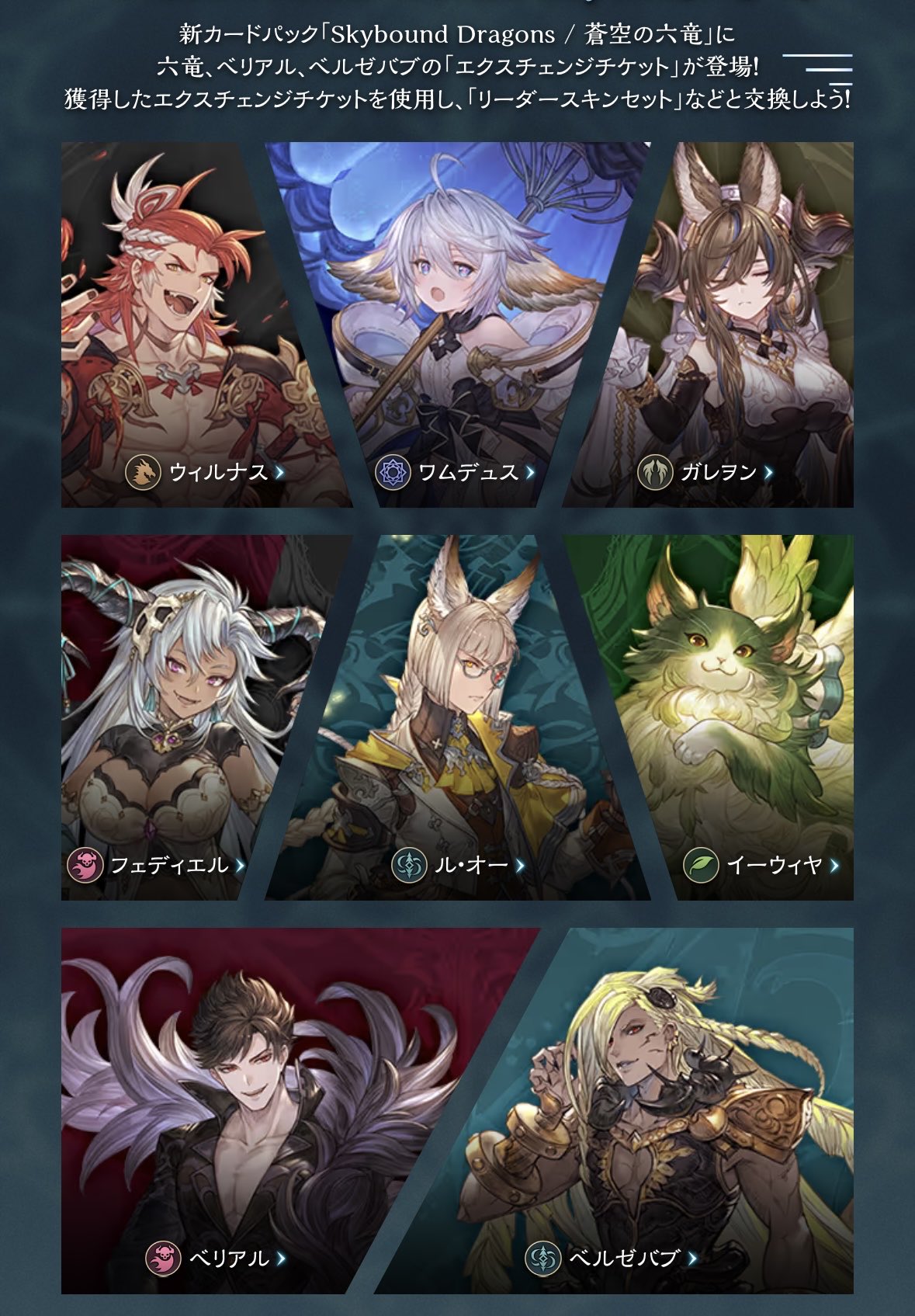 Skybound Dragons includes 8 exchange tickets:• Belial• Beelzebub• Ewiyar• Wamdus• Wilnas• Fediel• Galleon• Lu WohThe following exchange tickets can be redeemed for your choice of a corresponding Leader Set, Card Style & Home Screen Background Set, or Visage Set.• Belial• BeelzebubThe following exchange tickets can be redeemed for your choice of a corresponding Leader Set, Card Style & Home Screen Background Set.• Ewiyar• Wamdus• Wilnas• Fediel• Galleon• Lu WohLmao fuck this gacha