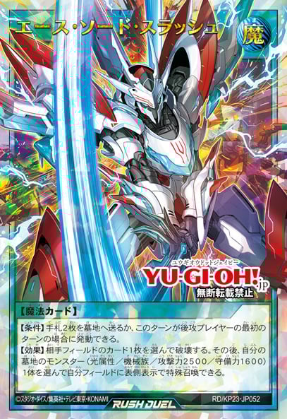 RD/KP23-JP52 エース・ソード・スラッシュ Ace Sword SlashNormal Spell Card【REQUIREMENT】 Either send 2 cards from your hand to the GY OR You can activate this card if this card if this is your first turn if you are the player going second.【EFFECT】 Choose 1 card on your opponent’s field and destroy it, then you can choose 1 LIGHT Machine Monster with 2500 ATK and 1600 DEF in your GY and Special Summon it to your field face-up