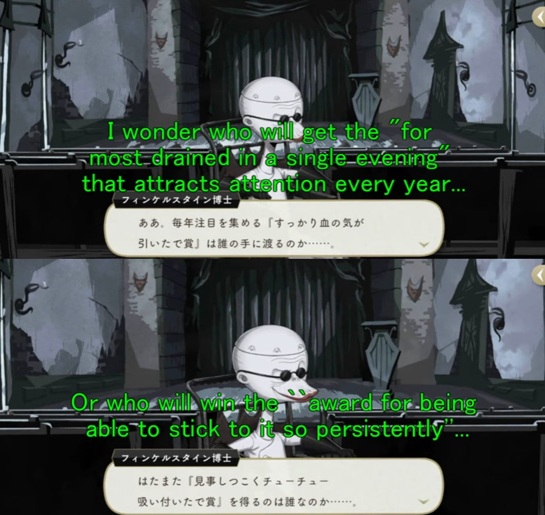 >>543706825It's these. First one can also be translated (with DeepL) as:Ah. Who will take home this year's coveted “Pale as a Ghost Award”?Second following is:And who will win the “Award for Admirably Persistent Sucking”?The original line from the movie has the vampires winning for "Most Blood Drained in a Single Evening", honorable mention goes to Dark Lagoon leeches.