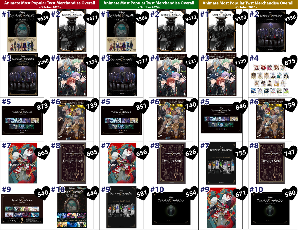 A top-ten list of the most-liked Twisted Wonderland merchandise overall available through Animate’s online store (that is still in stock as of October 2025).https://yuurei20.tumblr.com/post/798182859621974016/a-top-ten-list-of-the-most-liked-twisted