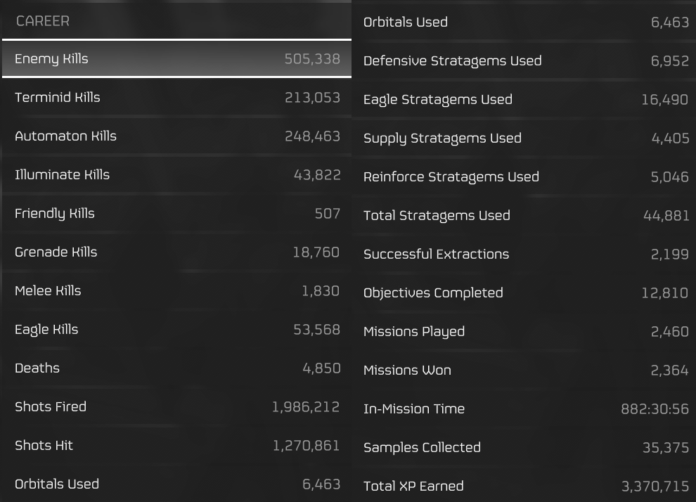 >>543680372After getting some detox playing other games because helldivers 2 won't stop crashing to super destroyer, I will say that the big elephant in the room issue is the helldivers armor system reducing damage to 0 at one step.In most other, NORMAL, games there is unarmored, man-sized wearing armor, light vehicles, tanks. What helldivers calls "light penetration" only hits what most games call "unarmored". Sheet metal, less thick than a ceramic plate is "heavy armor" in helldivers, which places it at light vehicle tier in most other games. Helldivers is the only game where .223 equivalent rounds (what's loaded in the liberator) bounce off of man sized enemies.