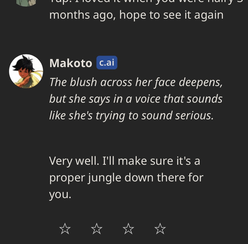 >>543672774Mannnn you reminded me of the early days of C.ai, and eventually having to dance around words to get sex.
