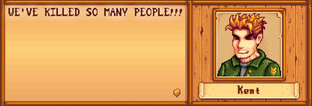 Well, dang. So I just finished Emily's batch of higher res portrait redraws, only to realize after reviewing her dialogue files again that what I originally thought was three instances of her using her Yoba praying portrait was actually only a SINGLE line, that she can only say on a SINGLE morning of the year, if you're married to her and she's in the house. Same goes for her anger portrait which is only used once because every other result I got for the $a portrait code was actually other characters in cutscenes involving herFeeling more and more like I gotta find the time to make a mod to add dialogue using these uncommon portraits at some point. Canon-Friendly Dialogue Expansion barely adds any. What seems like something that Emily would actually get angry about? Joja pollution?