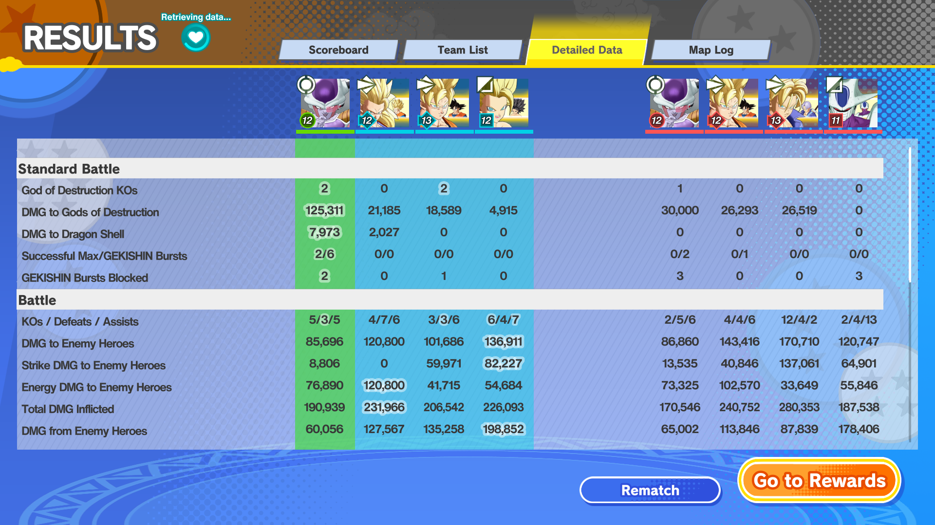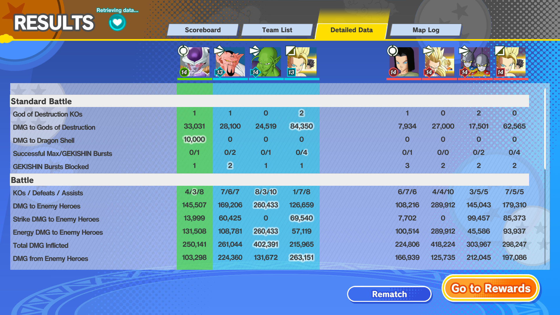 >Enemy team at some point gets blood thirsty>Like they really want to kill all of us>All of them>I realize this, and attack their towers>Even manage to get two Max Gekishin Bursts>Despite using Freeza, I realized that since they're so one dimensional, I'll ignore bosses and attack their towers>At some point they get the message>But by then they have one tower that is almost completely destroyed, and another that is at full HP>All the while we still have 3 towers>Even when they have only one tower left, their bloodlust never leaves, because at the end, their Trunks is fully committed to chasing our Caulifla>I just sneak in and destroy their last towerI wonder if they'll learn a lesson in defense... They had a Freeza too, and he only left a poorly positioned Dodoria... So I just walked around him, used a Max Gekishin Burst, and their Freeza even could interrupt me, but he decided to set up Zarbon instead of, just using a rush attack... I think I should use Gekishin High instead of Snowball with Freeza from now on, so I can have better rat duty...