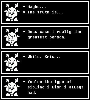 Deltarune is a Christian game about forgiving horrible people. There isn't much growth left for Kris if Dess is the final boss if we go by the theory that Dess was just a cool older sister Kris looked up to. There's no challenge for Kris there.