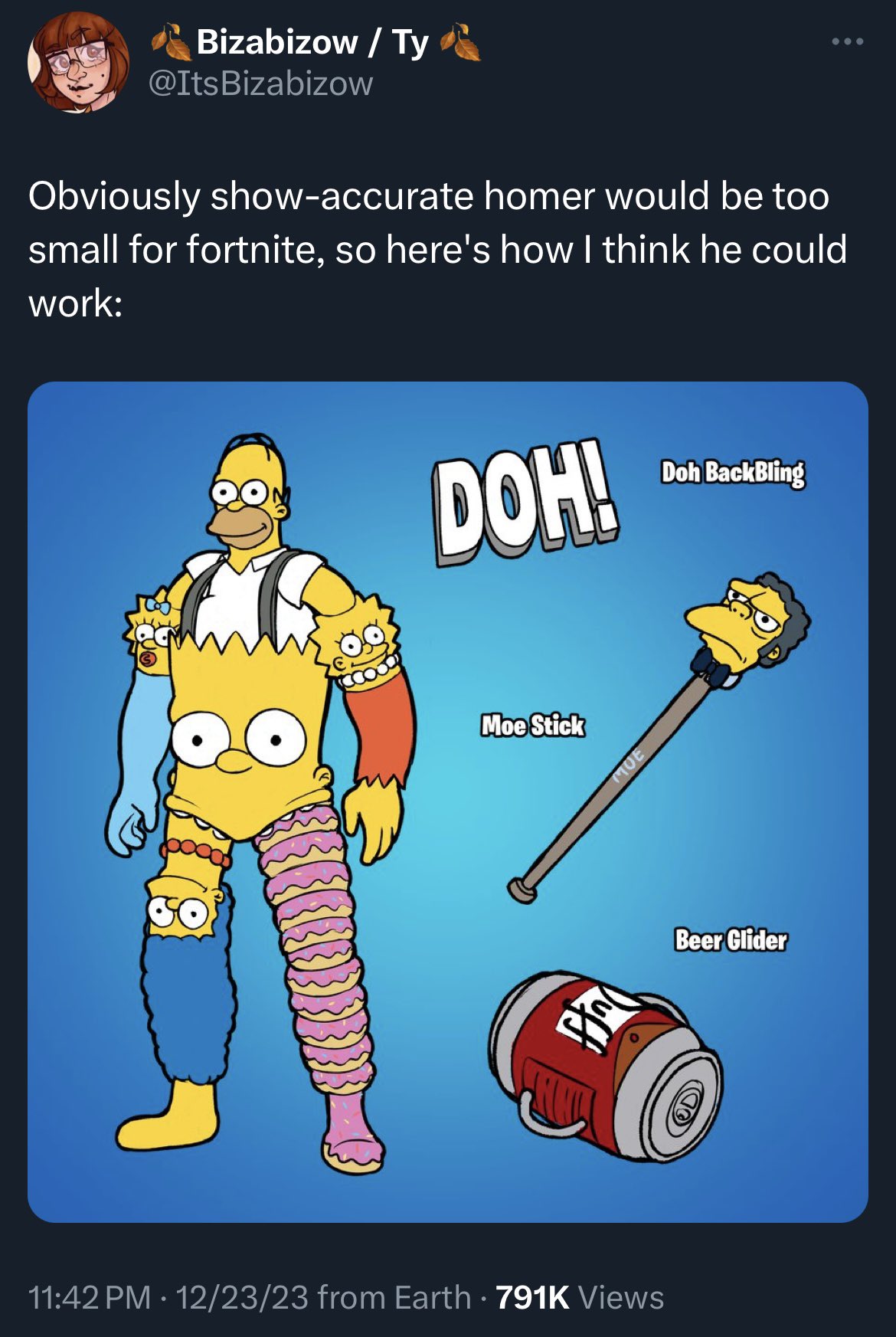 >>543809046>show-accurate homer would be too small for fortniteif they can make Cleveland work homer will be fine, he's not like peter were they had to change his proportions to fit the fortnite skeleton