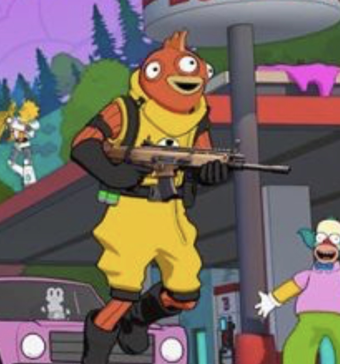 Homers Car and the cat guy skin (can’t remember his name) in the back