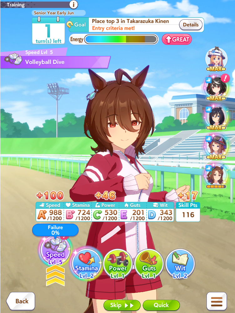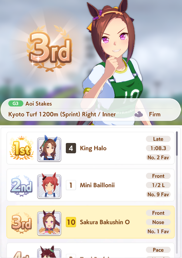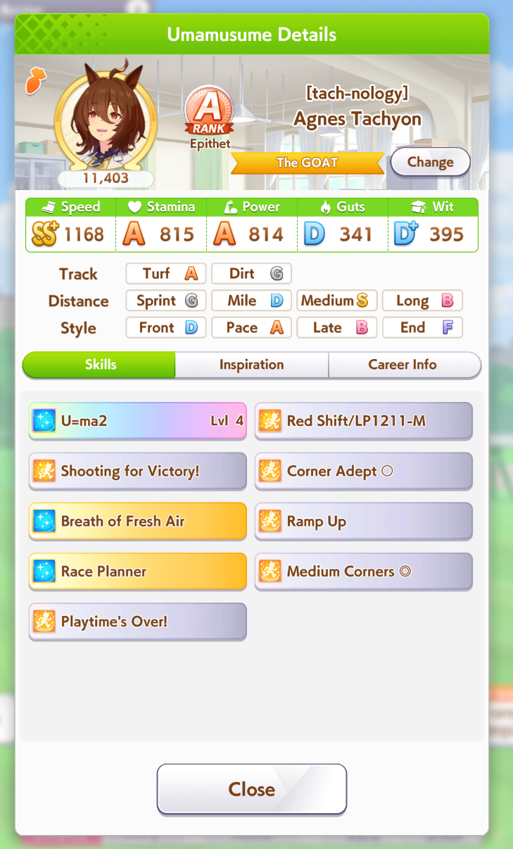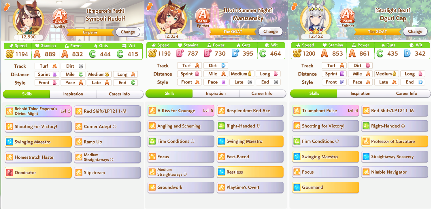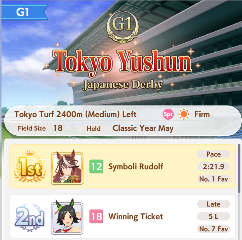 >Make an end ace>She decides to stay in 9th forever, spurt doesn't work on this track, I hate Gold Ship>Make a late ace>Stay in 6th for most of the track, uh oh did that Gold Ship proc ult now she's suddenly in sixth place and gets to proc Iron into SFV into Red Shift and win, I hate Gold Ship>Make a front ace>Actually you didn't because you didn't manage to get Groundwork, Medium, Greens and Mid Race Velocity while getting enough Stamina to not die and Uncapped Speed>Make a pa->Bwo...