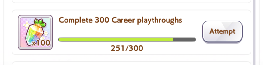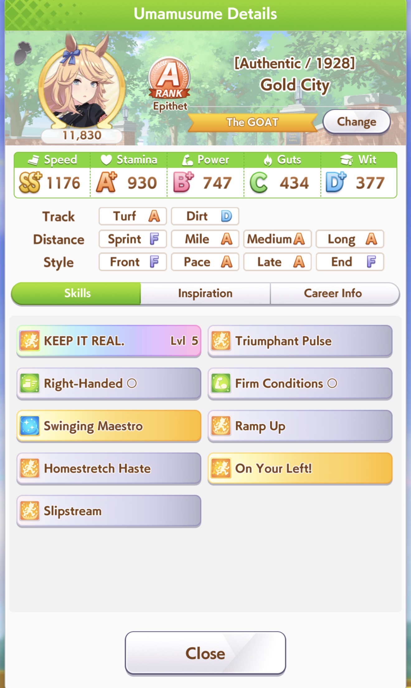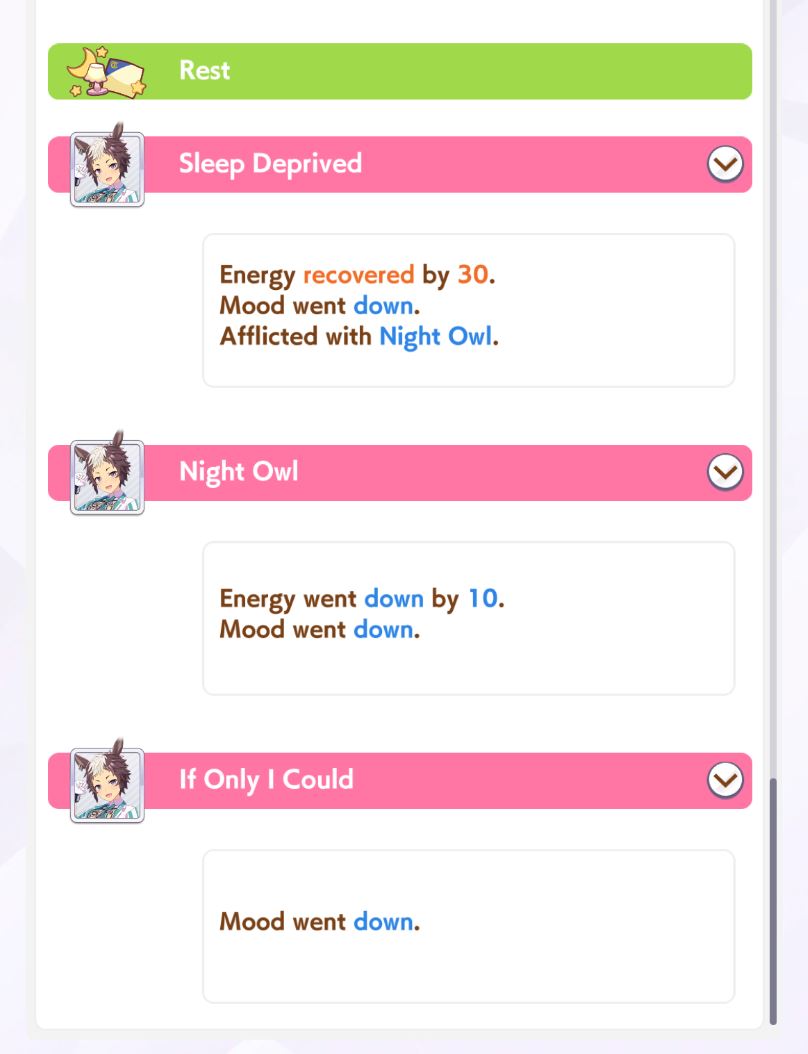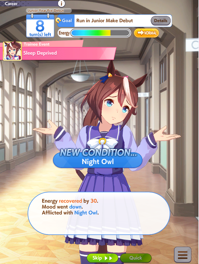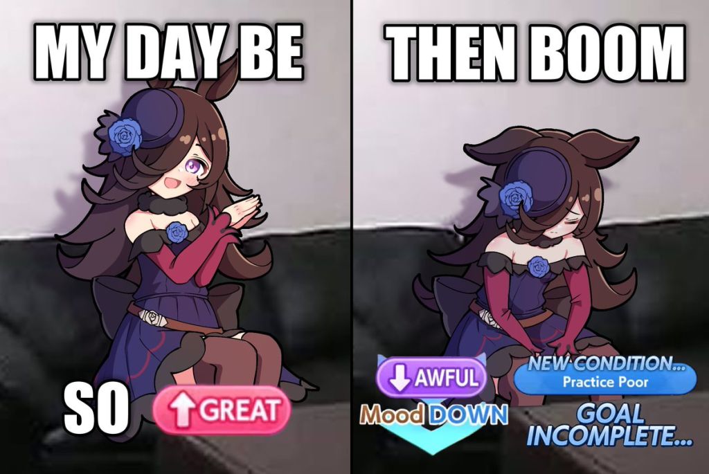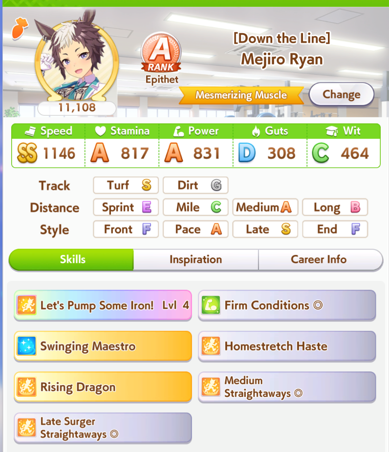 >Make an end ace>She decides to stay in 9th forever, spurt doesn't work on this track, I hate Gold Ship>Make a late ace>Stay in 6th for most of the track, uh oh did that Gold Ship proc ult now she's suddenly in sixth place and gets to proc Iron into SFV into Red Shift and win, I hate Gold Ship>Make a front ace>Actually you didn't because you didn't manage to get Groundwork, Medium, Greens and Mid Race Velocity while getting enough Stamina to not die and Uncapped Speed>Make a pa->Bwo...