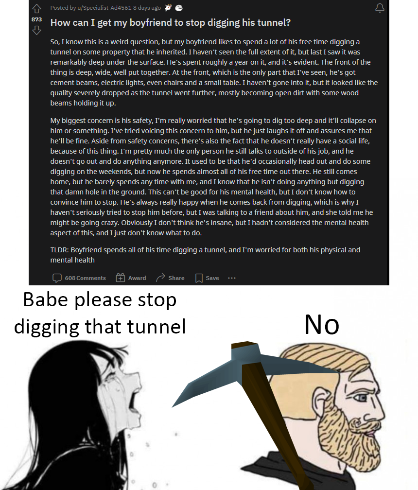 >>543892257>this cant be good for his mental health>her friend says he might be going crazy>he always looks happy when he comes back from diggingWoman are retarded. They have absolutely no idea what it means to be a man.