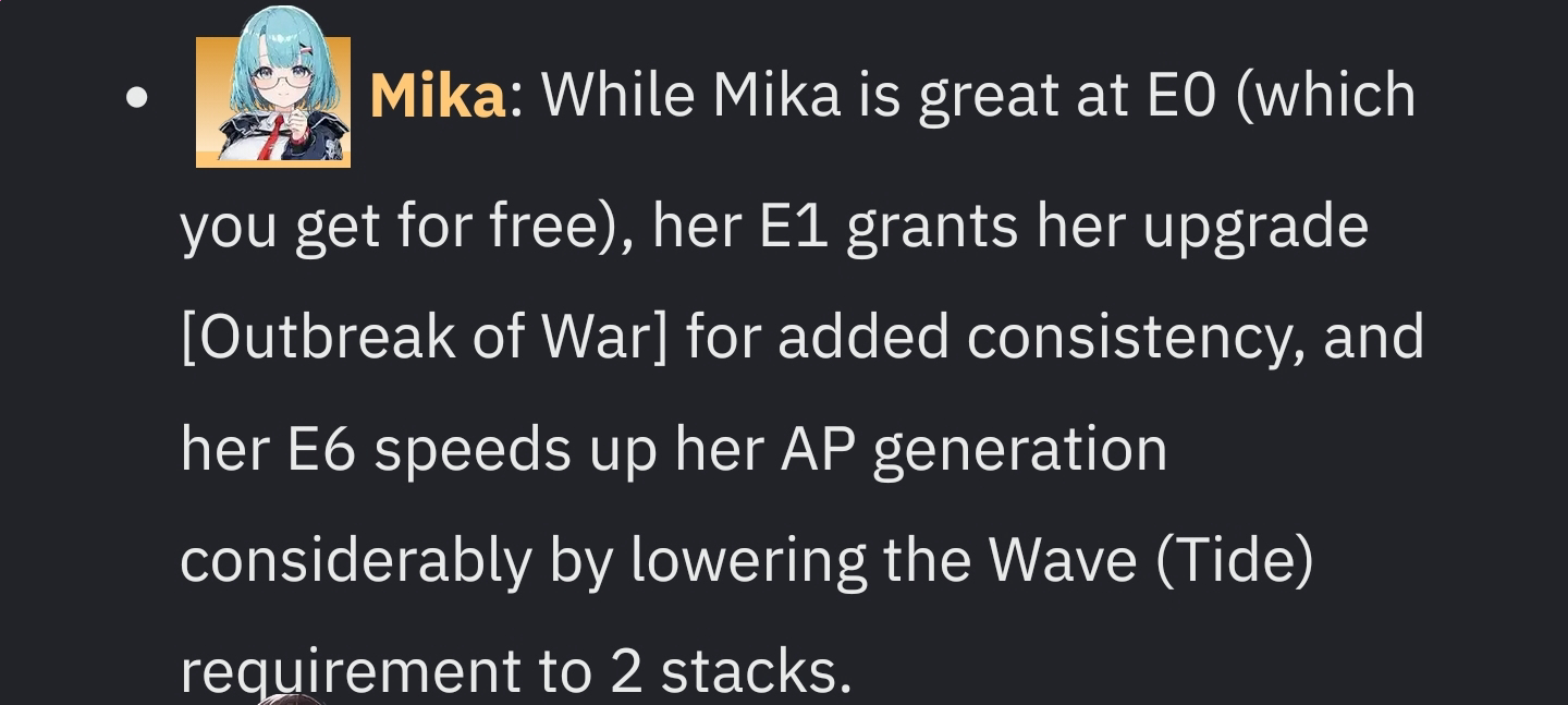 >>543914317Mika passive, get 3 Waves (like an atom icon under her HP) and they reset to 0 while giving you one AP.