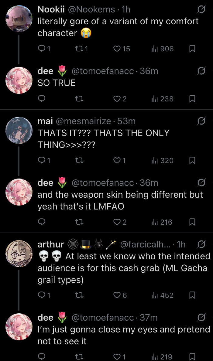 Yes, but you are a troon who came into gachas with COVID. We used to slurp and eat it up, and we didn't care because we played these games for parasocial relationships. Nobody was deluded about what these games were for, and we embraced and accepted it. We played these games so that the devs would sell us cute waifus who love you, so we would spend. Then COVID happened, and you parasites came along with it.