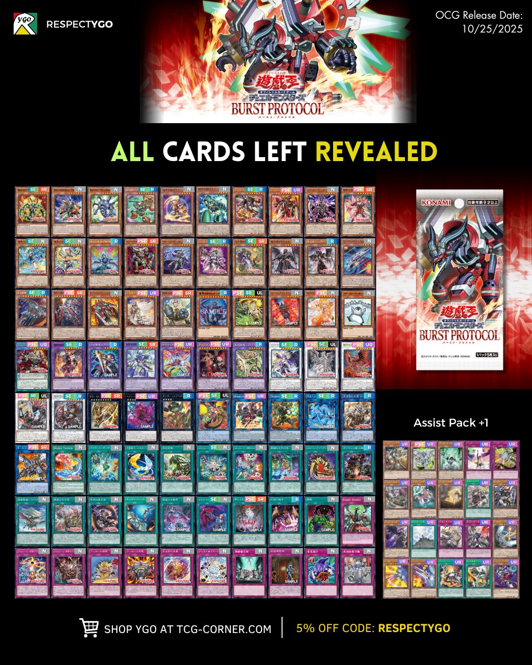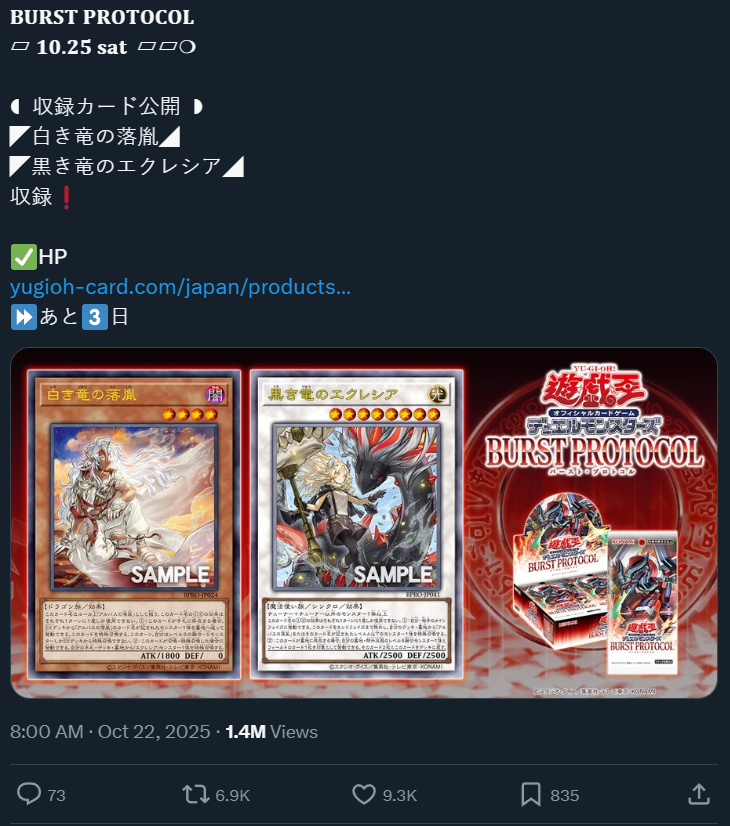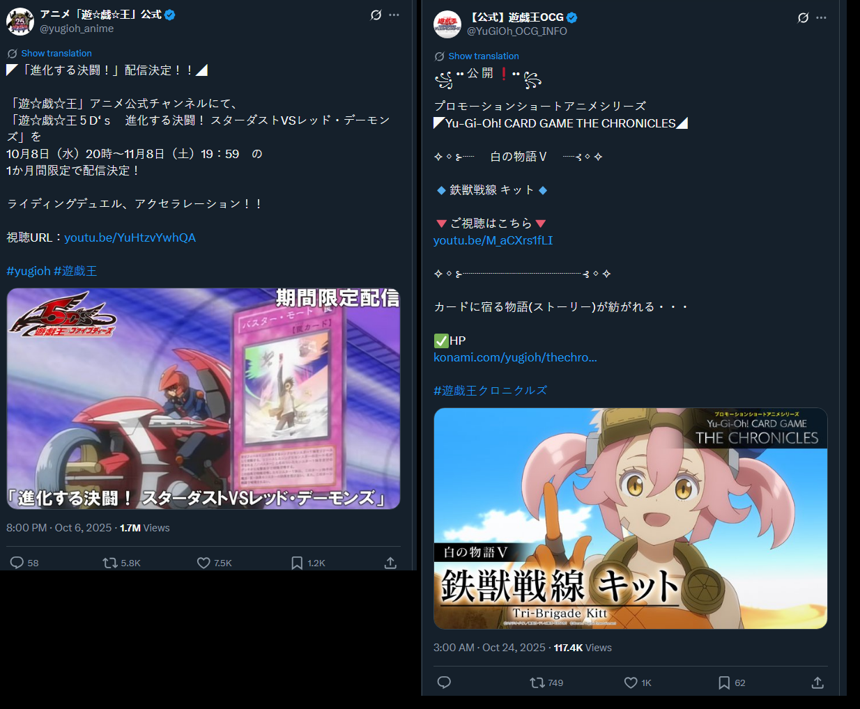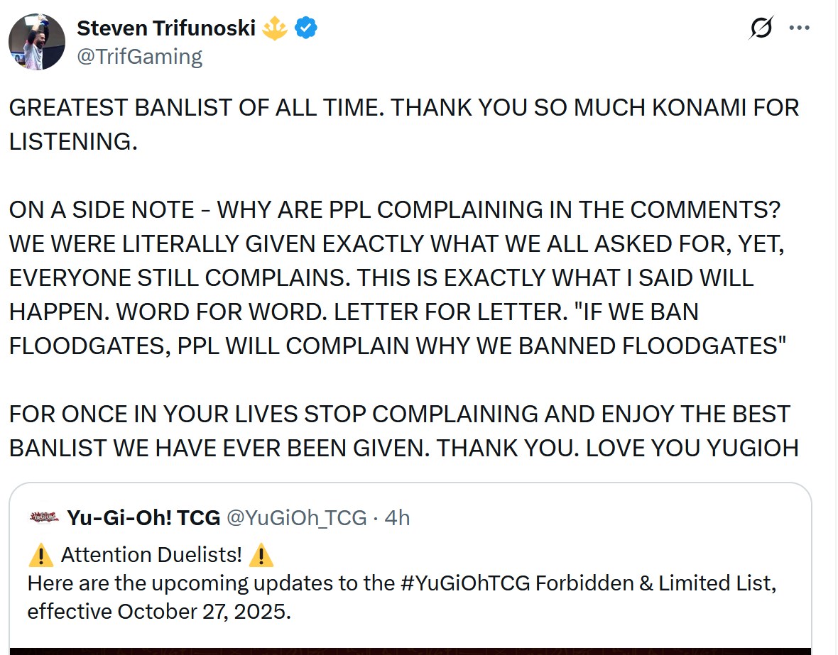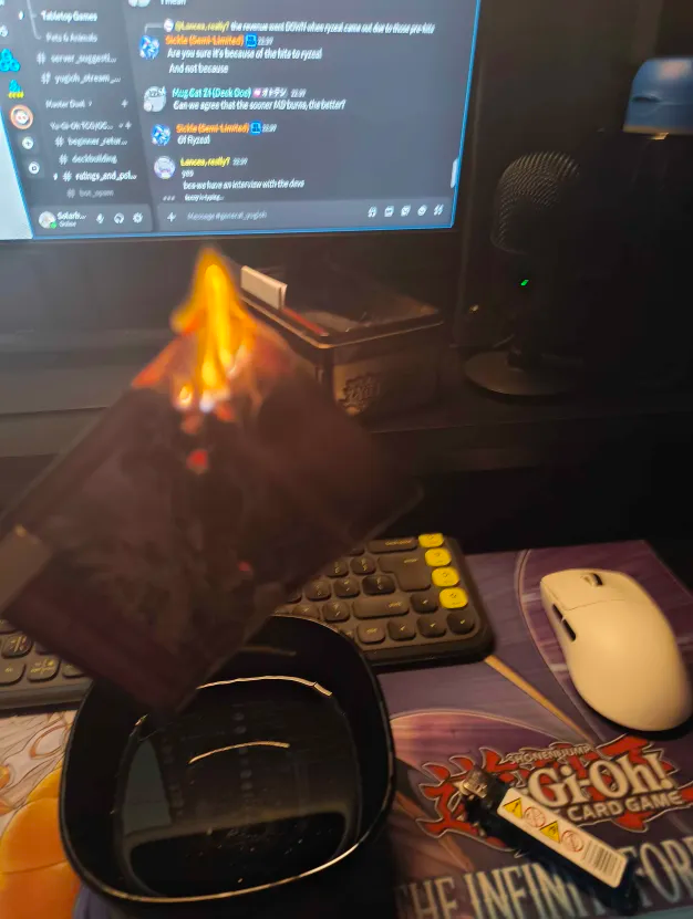 #6640 - S to Spit editionPrevious: >>543838175>SimulatorsAutomated:●EDOPro (PC/Android): https://projectignis.github.io/download.html●Master Duel (Multi-plat): https://store.steampowered.com/app/1449850Manual:●Duelingbook (online): https://www.duelingbook.comTag: “/dng/” Password: “vidya”; on EDOPro, specify server.Genesys Duels: MR5, TCG, Custom Rules: No Links/Pend/EMZ/Pend Zones>LinksRulebook: https://www.yugioh-card.com/en/rulebook/Wiki: https://yugipedia.comProbability Calculator: https://yugioh.fyiStock Market: https://yugiohprices.comDatabase: https://www.db.yugioh-card.comMisc Info: https://www.formatlibrary.comBlog:https://yugiohblog.konami.com/Alt Format:https://www.yugioh-card.com/en/genesys/>BanlistsTCG: https://www.yugioh-card.com/eu/play/forbidden-and-limited-list/ (Oct 27/Next List: TBA)OCG: https://yu-gi-oh.jp/news_detail.php?page=details&id=2341 (Oct 1/Next List: Jan 1)>DecklistsOCG: https://roadoftheking.com https://tonamel.com/competitions?game=yugioh_ocgTCG: https://ygoprodeck.com/category/decks/tournament-meta-decks>NewsJP: https://yugioh-starlight.comEN: https://ygorganization.com>Upcoming SetsOCG:●Terminal World 3 (Nov 22)●Premium Pack 2026 (TBA, Dec ?)●DUELIST BOX -Prismatic Summon- (Dec 20)●THE CHRONICLES DECK - Charmer (Jan 24)●Blazing Dominion (Jan 24)●LIMIT OVER COLLECTION -THE PROTAGONISTS- (Feb 28)●LIMIT OVER COLLECTION -THE RIVALS- (Mar 20)TCG:●Legendary 5Ds Deck (Nov 7)●Phantom Revenge (Dec 4)●Burst Protocol (Jan 23)●THE CHRONICLES DECK - Spirit Charmers (Jan 23)>Events●/dng/ Friday Night Tourney 4 (TBA)●/dng/ League S1 (Week 8, Oct 19-Oct 26):https://challonge.com/dngleagueseason1