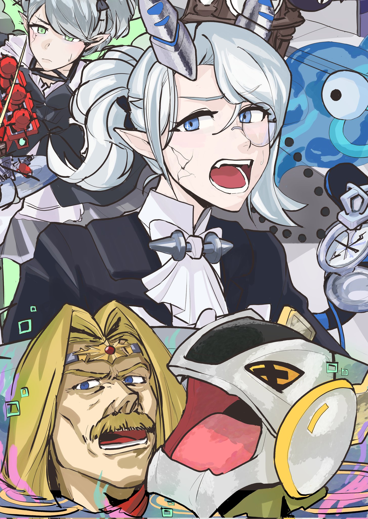 >>543972423White Albaz has his dragon ears, forehead gem, and left shoe, all of which were lost during Expulsion. The timeframe is clearly during Golgonda.