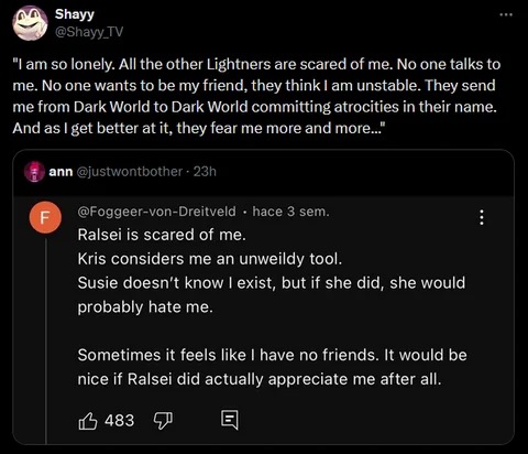 >>543962910Berdly is really insecure and views his own intelligence as his only real trait worthy of love. He also is capable of dropping that pretension to do the right thing, like how he drops the arrogant nerd facade in the weird route. I think Berdly needs someone to help make him more secure about himself, but is aware enough of his issues to work on help work on them and make a little less self serious. That's why I think him and Kris might actually be romantically compitable with each other.