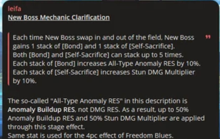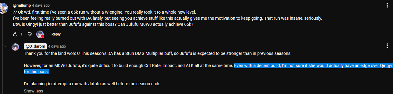 >>543993350Her WEngine is super relevant in the context of the exact scenario though. https://youtu.be/8KdviSANdZA?si=omvRLdODlyr5bdKm&t=65It's this exact sequence here, you have to dump resources after stun ,before and after the Defensive Assist section. Qingyi excels at this because of her ult, being able to EBA Ult EBA gives her really bursty daze output. It's not that Ju Fufu strictly can't do it, it's that building M0R0 Ju Fufu to have enough daze to do it while competing with Qingyi's stun damage buff is hard. You either roll her sig or spend a lot of time fishing for idyllic Defensive Assist patterns early to make sure Ju Fufu can ult twice before and after the Defensive Assist minigame. You can see this in yoji's run here https://youtu.be/gNnql9QdGRw?si=pDZF4MC1iCzN6eyt&t=67This is kind of what I meant about the stars aligning for Qingyi though, Qingyi's damage buffs have always been very strong. The actual problem with Qingyi is fieldtime, and it's inversely the primary strength of Ju Fufu - she lets Yi Xuan on-field. You'll never see Qingyi keep up with Ju Fufu (much less do better than her) on any other fight where Yi Xuan/Ju Fufu get to play more traditionally. You just spend too much time doing low-value actions as Qingyi for her to be better. Miasma Priest is just a perfect storm where the constant Defensive Assist minigames means Qingyi gets to skirt around what is her biggest weakness while still leveraging her primary strength (massive stun damage). This is the same reason why double stunner does surprisingly well for YX on this fight (ie even Qingyi+Ju Fufu is really strong), you get to play them like they're supports (most stunners have good buffs) without any of the normal drawbacks that come with double stunner.Anyways I hope this didn't come across as me shitting on Ju Fufu, I just think Qingyi is underrated and her performance on this fight is a really relevant anecdote for proving why people shouldn't overlook her.
