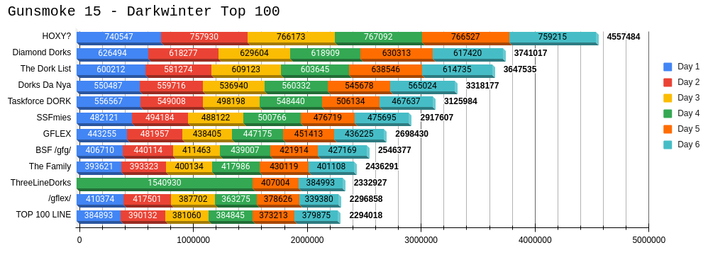 Knight Sabers have room for new members on Dorkwinter>Outside of Gunsmoke login once every 7 days>During Gunsmoke try to use 2 tickets a day>Auto is acceptable>Skipping some days during Gunsmoke is acceptableOur support list has the following (and more) V6:>V6 Jiangyu>V6 Andoris>V6 Springfield>V6 Qiuhua>V6 Klukai>V6 Yoohee>V6 VectorWe always get top 5% but usually exceed it with 3-4%.Platoon UID: 100945Danchou UID: 767763 (Feel free to add to reserve a slot)