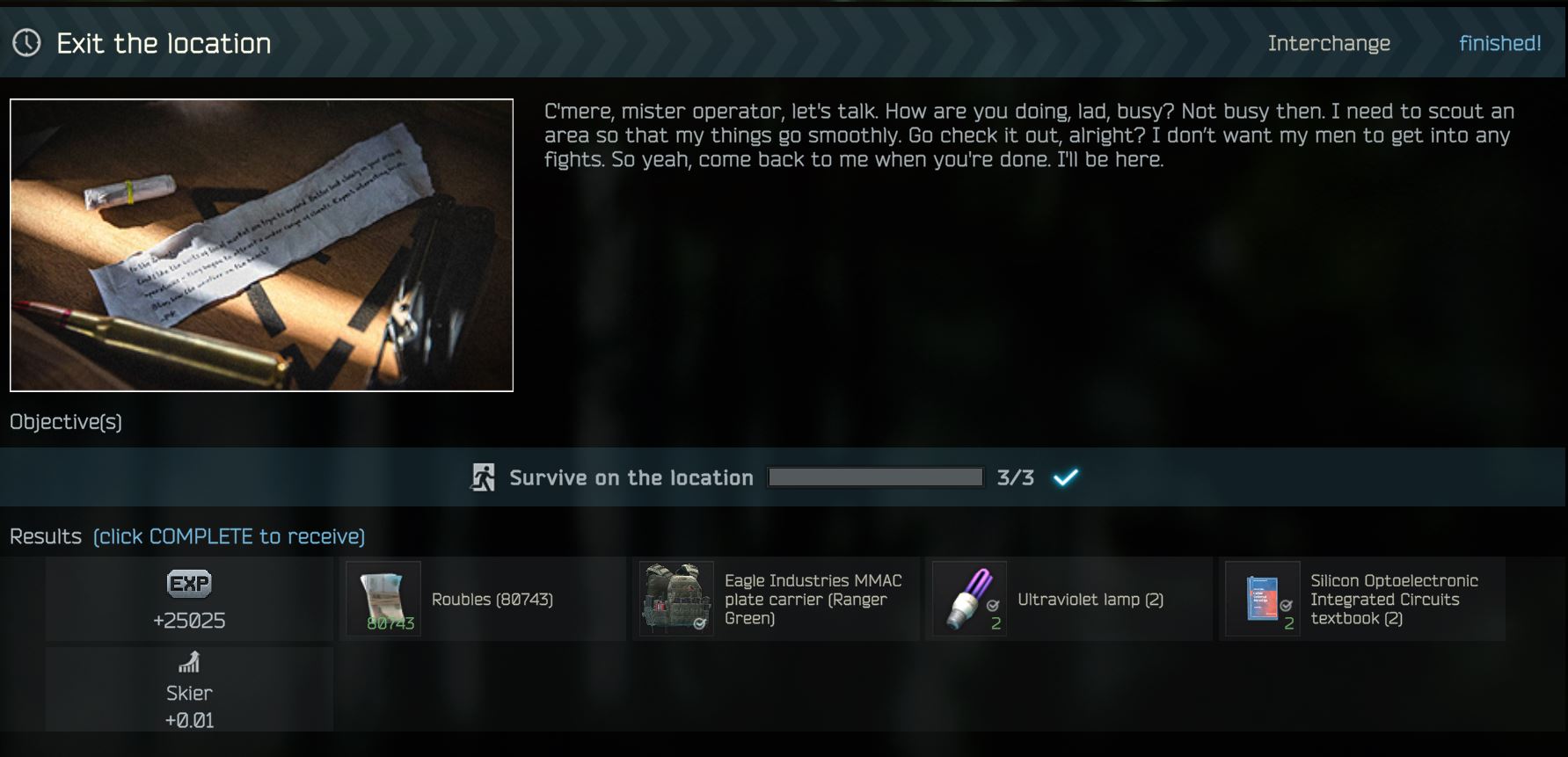 >>544058616Keep the axe because you will have missions to kill boss/pmcs with that axe later.