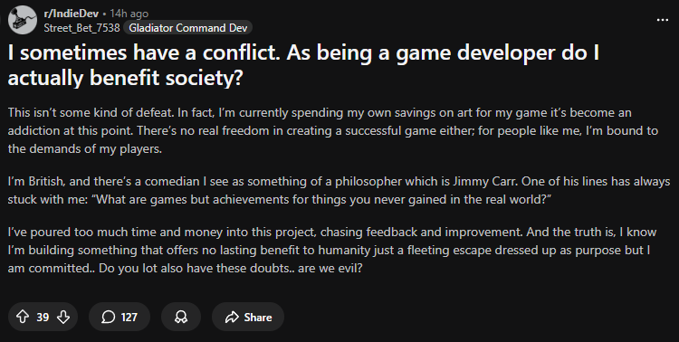 >>544023640just make games that incentivize people to not waste time and contribute to societyeasyproductivity simulators are a good way of doing this, giving dropout NEETs a taste of how it feels to contribute to society could set them off in a positive directionvideo games are also useful for dealing with insecurities, as after a freak grinds competitive league of legends for 3,000 hours and hits his goal rank, he'll have no doubt about his individual competence and will be completely okay with switching to casual gaming and getting a job>i've done everything i wanted to do, maybe i should go be normal nowvideo games are only bad if they're deliberately designed to be badi believe video games made with truly good intentions are purely beneficialundertale, for example, has probably saved countless socially isolated freaks from committing suicide due to the friend simulator aspect, inspiring music, and uplifting story of never giving up and being good to other people>>544023925https://youtu.be/L3Yz4U4XHlMthis game uses voice acting, 1.6m views on youtube, no serious complaints, 185 reviews on steam since oct 15 2025, 88% positive ratingpeople can tolerate AI voice acting, don't worry, just make a good game