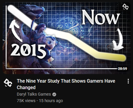 >>544128914That downward trend is for one metric which is players seeking strategy elements in their games. https://youtu.be/H0FmLGhF8fc&t=265Gaming as in industry continues to grow and although zoomers and younger gens don't play games as much they still like the same things they always did.