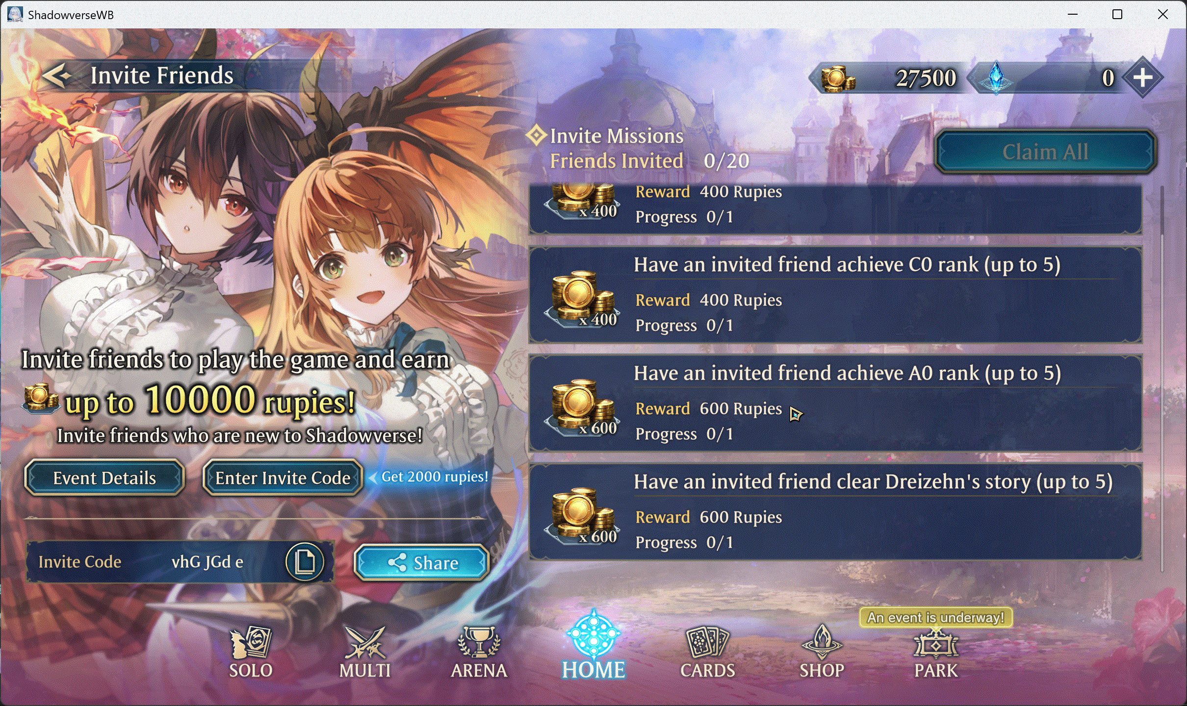 >News4th Card Set Skybound Dragons revealed! Coming October 29thhttps://collaboration.shadowverse-wb.com/granbluefantasy/en/Zombie Land Saga: Yumeginga Paradise Special Login Bonus!https://shadowverse-wb.com/en/news/detail/?id=01K7KJVACTJC6QZZ2BTWZE9FTPGrand Prix: Heirs of the Omen Cup (Vol. 2)!https://shadowverse-wb.com/en/news/detail/?id=01K7KZWQM8S10NH386ZJ1Y4WA1Umamusume: Pretty Derby Mini-Collab!https://shadowverse-wb.com/en/news/detail/?id=01K4M3WA216QY2MZ2QEH8SSJM0Battle Dungeon!https://shadowverse-wb.com/en/news/detail/?id=01K5EEYCTPCC9VXSEX5AV5ESWBRegistration for the Shadowverse Online Championship 2025 November is Now Open!https://shadowverse-wb.com/en/news/detail/?id=01K7KVSDKV5VD3KZ81GAXDX60K>4th Card Set: Skybound Dragonshttps://www.youtube.com/watch?v=RHb3NBZDOXEhttps://shadowverse-wb.com/en/cards/pack/skybound-dragonsRevealed Cards: https://svlabo.jp/blog-entry-1438.html>Gacha Leaders: Belial and Beelzebubhttps://www.youtube.com/watch?v=xjX3pud4tIshttps://www.youtube.com/watch?v=KfMnD-MDhwk >Gacha Leaders: The Six Dragonshttps://www.youtube.com/watch?v=C2urP-XateYhttps://www.youtube.com/watch?v=FhwTXBvet5Qhttps://www.youtube.com/watch?v=6jUnP4oFFaA>Battle Pass Leader: Zetahttps://www.youtube.com/watch?v=MDUGj5c0ufs >Resource Guide (decks, tier lists, guilds)https://rentry.org/svg-resourcesOfficial website & deck portalhttps://shadowverse-wb.com/en/https://shadowverse-wb.com/en/deck/Shadowverse Animehttps://anime.shadowverse.jpShadowverse Evolve TCGhttps://en.shadowverse-evolve.com//svg/'s card & leader database and deckbuilder (classic)https://svgdb.meShadowverse: World's Beyond Card Databasehttps://mhmkhlrdn.github.io/WBGDB/SiteLast Showdown: >>543974318
