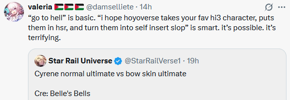 I think I'm going to pull Cyrene with the jades I have saved up, like I set out to do because waifu character, then log out and uninstall. I don't think I'll want to experience how bad she ends up being on release, and I was barely able to force myself to keep going through the Amphoreus slop.