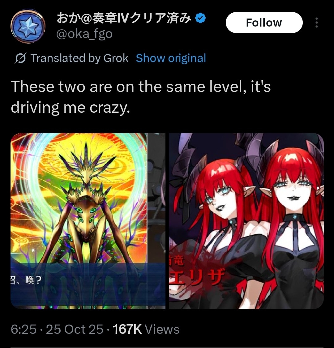 Previous: >>543818623>Final Halloween 2025; The Shining Diva in the Pumpkin Planet:●Event Period: October 22 ~ November 12 JST (3 weeks).▶Requirement: Fuyuki.▶Login Bonus: 3 Golden Apples and 18 Silver Apples.▶Main quest will be unlocked daily. Collect 'Diva points' to advance the story.▶Welfare servant: 4*Avenger Elizabeth of the End.▶Elizabeth of the End will have double the EXP when strengthening.▶Strengthening Quests:-Elizabeth Báthory (skill)-Elizabeth Báthory Caster (NP)-Both Mecha Eli-chan (skill)-Jacques de Molay (skill)▶Stormpods quests they will have their AP consumption halved.https://news.fate-go.jp/2025/halloween2025/>Final Halloween 2025 Elizabeth Báthory PU summon:●October 22 ~ November 12 JST.5*Lancer Elizabeth Báthory (limited).https://news.fate-go.jp/2025/halloween2025_pu/>Final Halloween 2025 PU 2 summon:●October 24 ~ November 12 JST.5*Foreigner Jacques de Molay (limited)4*Saber Siegfried (permanent)4*Berserker Kriemhild (story locked)●October 26 ~ November 2 JST.5*Rider Achilles4*Berserker PenthesileaBoth permanent.https://news.fate-go.jp/2025/halloween2025_pu2/>Future Schedule:●November 6~13 JST: Stormpod consumption will be excluded for Lancer and EXTRA Grand Duels.●Mid November: Grand Duel Archer.●Late November: Stormpod consumption will be excluded for Rider and Assassin Grand Duels.>/fgog/ Friendlist form and spreadsheet (2025):https://forms.gle/WK4dwSC6Mn2WQfZu8https://docs.google.com/spreadsheets/d/1leQ09m5klFajbCcededkANJfeMiAmVz-PbCI_r7xyXc/edit?usp=sharing>Utility links:https://pastebin.com/iaWmXAq7