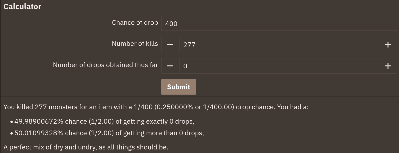 >>544206849that's not how statistics worksa drop rate of 400 means an average kc of ~277 for a drop. On average my next drop will be in the next 277 kills, meaning before 554>>544207005curiosity and torturing myself with "what could have been"
