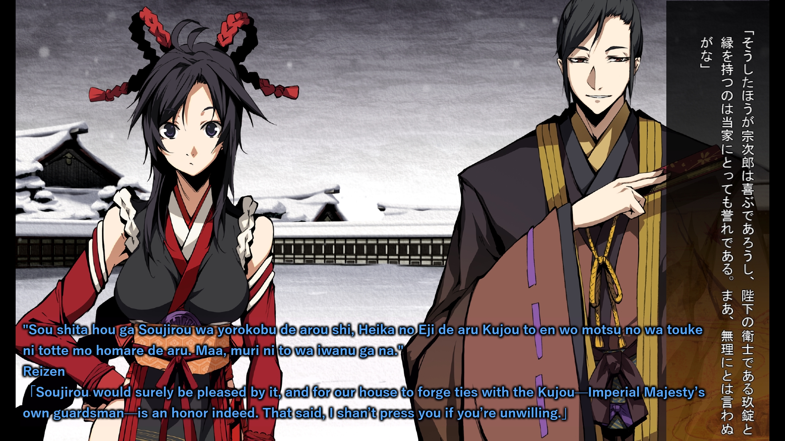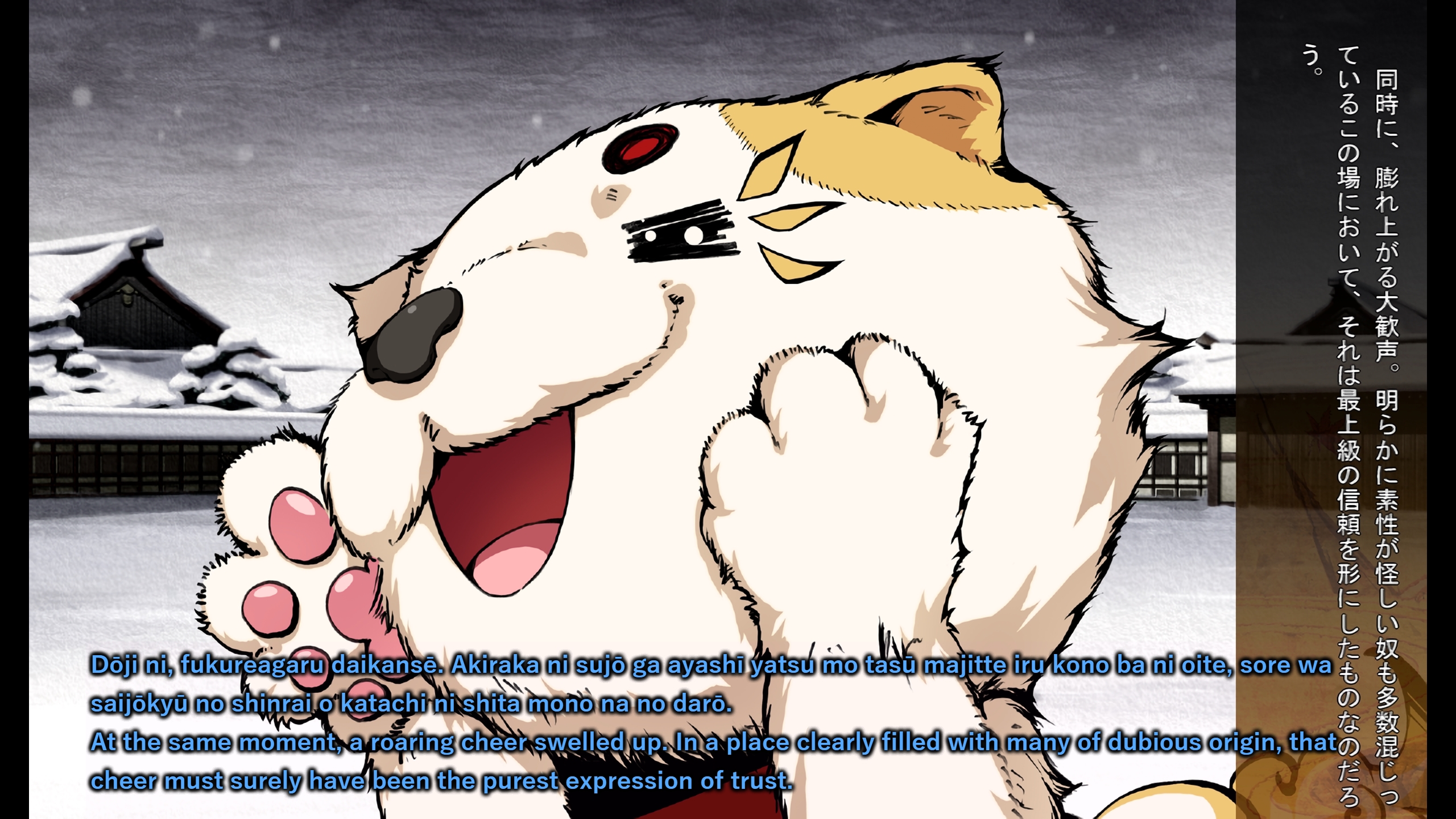 >“Magnificent! O masurao of our Divine Land, well done indeed!”>“The Eastern Expedition approaches! This year, in the Month of the Rabbit, we shall cross Awaumi and march upon Kegai! Our foes are demons who defy human law and reason—the Impure Land shall surely become a merciless field of death!”>“But we shall not lose—we shall triumph, I declare it! For no other reason than this: I believe that you, O masurao, shall become my sword and demonstrate your valor!”>“Now, let us go forth—with souls in our hearts!”>“Entrust me with that fierceness, that pride—let me embrace them!”>“I am the Shogun—”>“I am Koga Rindou Suzuka!”Actually using the kanji for shogun for once>“Woohoo! Lets go~!”based dog.>>544070357CUTE DOG.