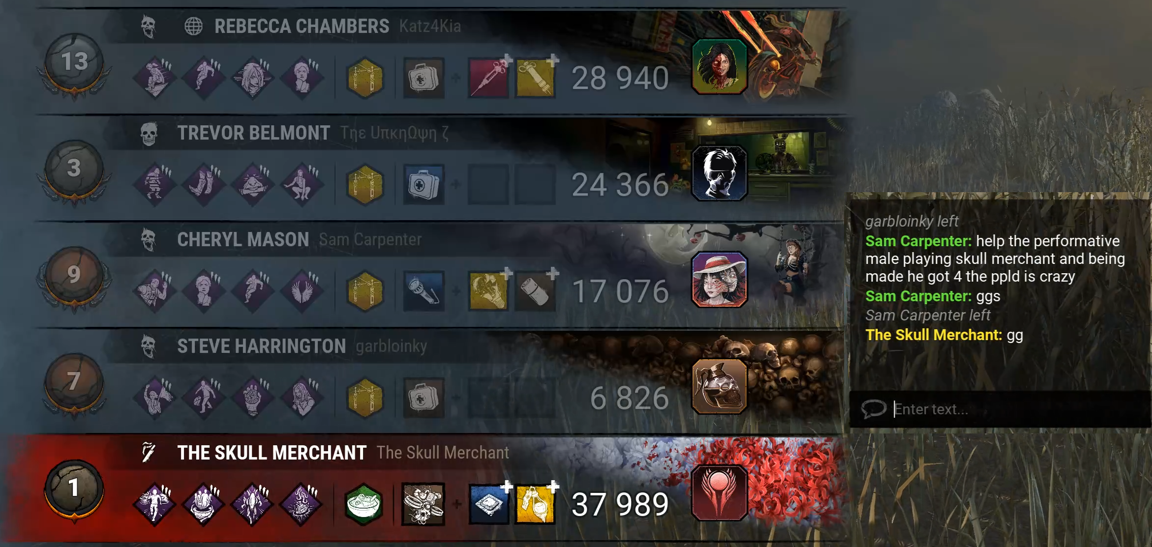 >>544441358>ghostfaceTHE stealth killer of this game if you play properly AND the map allows it. Very satisfying when it works and frustrating when it doesn't. One of the few characters in the game that can actually spook survivors.>dredgeIf you want to play with a handicap or have a humiliation fetish, then Dredge is your pick. Every game is a struggle, every chase takes 2 gens, every time you use your power you realize that third of the map has no lockers in it. The entity hungers...