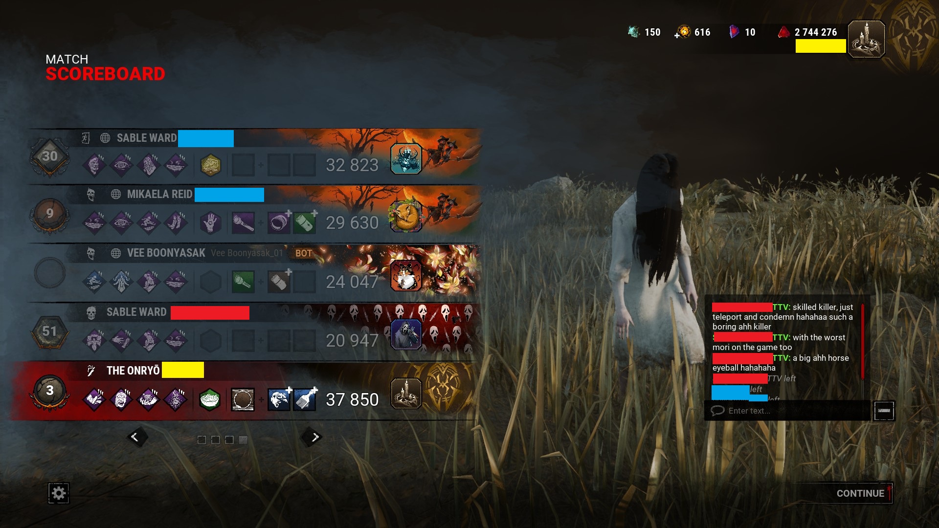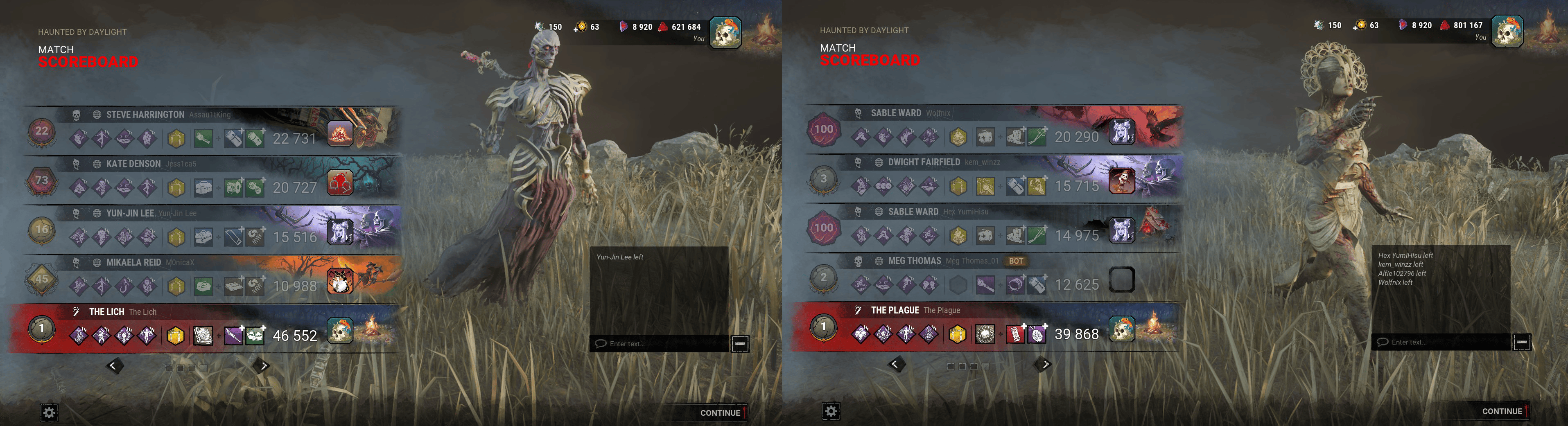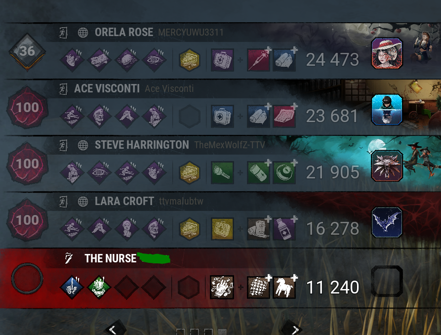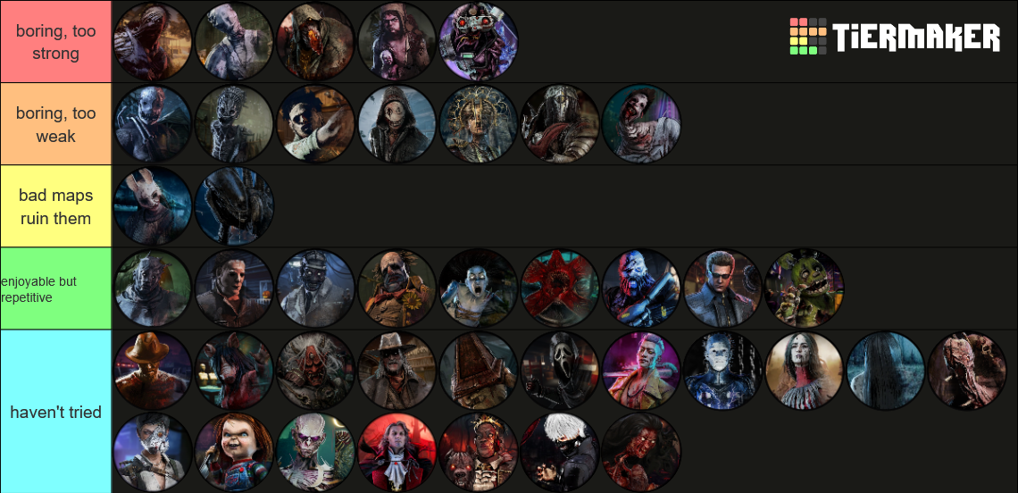 >>544147118>StrongerHillbilly, Nurse, Spirit, Oni, Blight, Twins, Singularity, Dark Lord, Krasue>On ParShape, Huntress, Clown, Oni, Executioner, Artist, Mastermind, Unknown, Lich, Houndmaster, Animatronic, Ghoul>WeakerTrapper, Wraith, Hag, Doctor, Cannibal, Nightmare, Pig, Legion, Plague, Ghostface, Demogorgon, Deathslinger, Trickster, Nemesis, Cenobite, Onryo, Dredge, Knight, Skull Merchant, Xenomorph, Good Guy