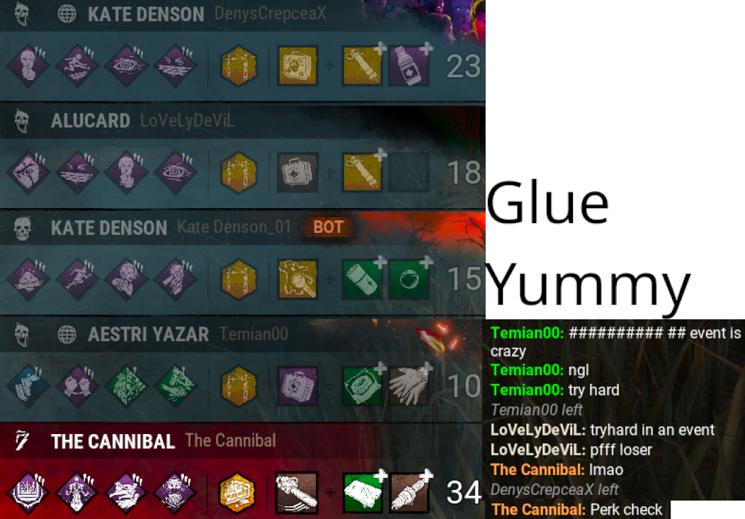 I had a dream they were doing a PTB with 3 new killer powers (the models weren't done) and a new realm and the best part of the whole shitshow was the realm because it was a post-apocalyptic wasteland where when the EGC started a nuke dropped in the distance and caused it to get all windy and smoky. Anyways one killer was nicknamed "buggy" and its gimmick was there were 6 grubs crawling around the realm anyone could pick up (survivors were hindered and couldn't take fast actions but if they were hit with a basic attack the grub died instead and Buggy was given a secondary power). Buggy's secondary power was to chuck the grub. This did nothing. What DID do something was its primary power, which launched a sticky egg that could latch onto surfaces. When a grub was hit by an egg or you chucked the grub at the egg, the grub would die and the egg would hatch releasing a wasp, which acted like Knight's assassin with a 360 degree detection range. Some people were doing 360 kobes with grubs to set off wasp attacks and wasps were basically impossible for most survivors to avoid. The second killer was the Magnet. His model was trapper on a bicycle. His power was he dropped traps occasionally or could drop a Super Trap. Normal traps latched a magnet to survivors and when they approached a second trap were brought closer until they triggered the second and were stunned. The third killer was forgettable but had something to do with computers.