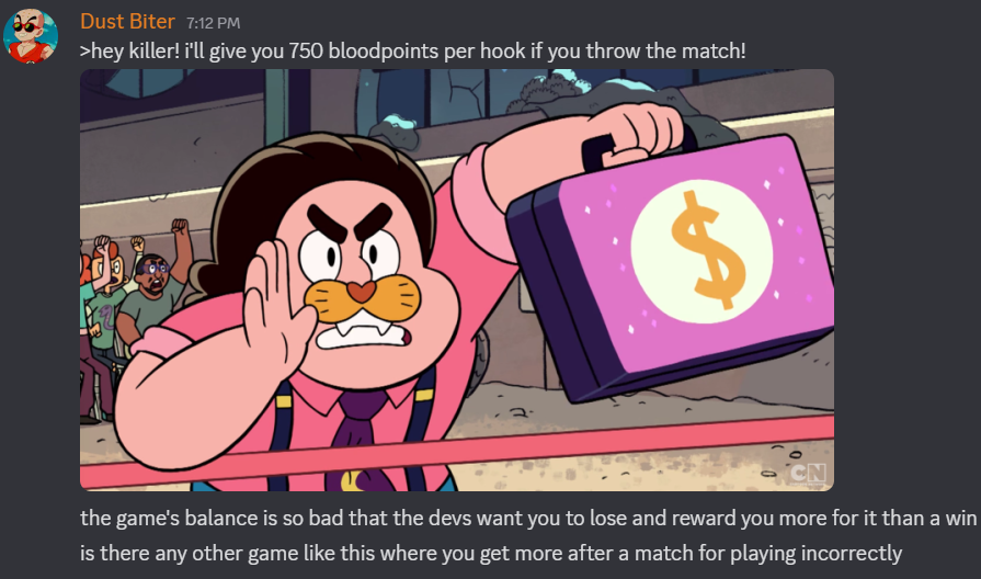 >>544171000like i don't understand what these guys expected. tunneling was out of control. every game revolved around it. streamers were abusing it and advertising a game where people can't play because they're on the ground/on a hook for an entire match and just DC in the first few minutes of a match. even survivor streamers would end up as 3/4 gen hatch matches because their team mates would just evaporate or DC. did they think the game was just going to continue on like that in perpetuity where they get their tunnel kill at 5/4 gens and win every game? in their head they're supposed to win every match?