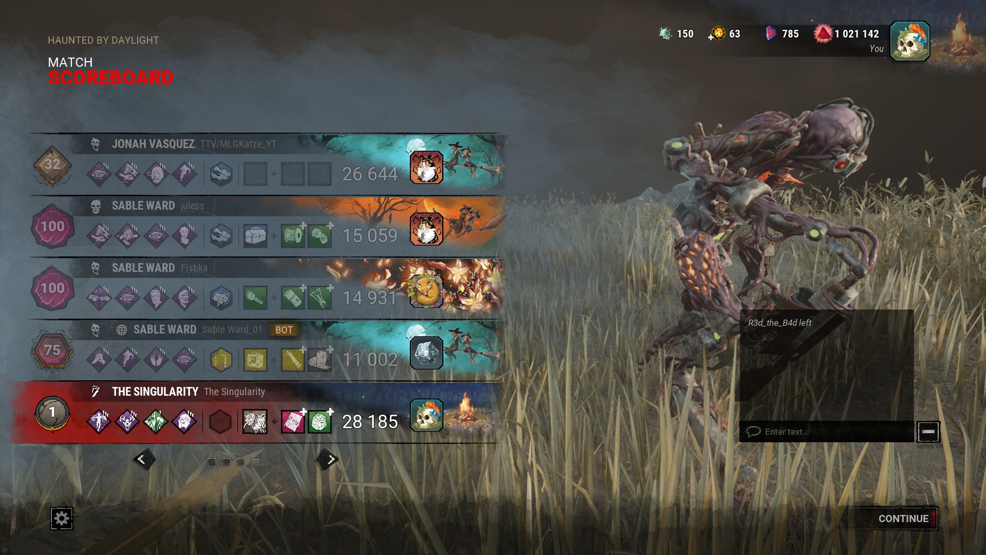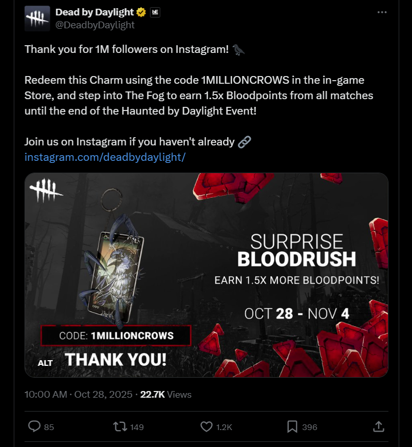 Spoopy halloween edition>What is Dead By Daylight?Dead By Daylight is an asymmetrical multiplayer (1v4) horror-styled game where one player takes on the role of the Killer and four players take on the role of Survivors. The Survivors' objective is to repair generators in order to power and open exit gates to escape. The Killer's objective is to kill the Survivors.▶ NEWS>9.2.3 | Bugfix Patchhttps://forums.bhvr.com/dead-by-daylight/kb/articles/526-9-2-3-bugfix-patch>Halloween Eventhttps://deadbydaylight.com/news/haunted-by-daylight-2025-everything-to-know/>Official Stat Tracker Websitehttps://stats.deadbydaylight.com/▶ RESOURCES & INFORMATION>Official website:https://www.deadbydaylight.com>Patch Notes:https://forums.bhvr.com/dead-by-daylight/kb/patchnotes>Wiki:https://deadbydaylight.wiki.gg/>>543676180 LOOK AT THOSE MONSTERS!!!!