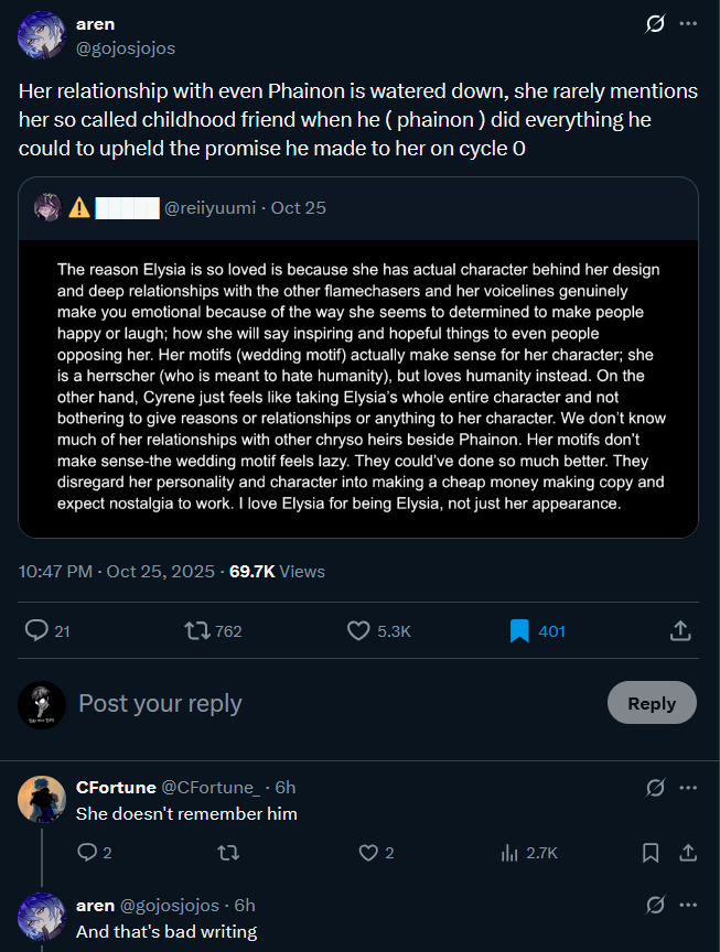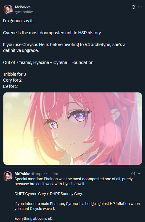 >Phainon is my favorite character because he suffered for 33 million cycles, killed his boyfriend millions of times and even scarred Nanook.>Cyrene is supposed to be a lesbian queen... or Phainon's wife but they ignored everything to sell incelbait