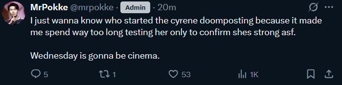 Context:Cyrene has been in the Creator Experience Server for 3 days now. He has been testing for 2 days now.Are we wrong again or what?
