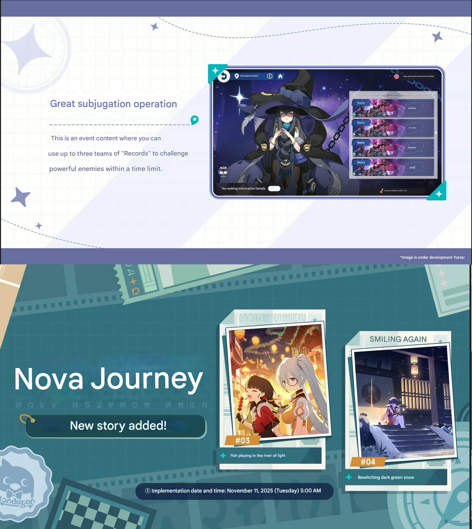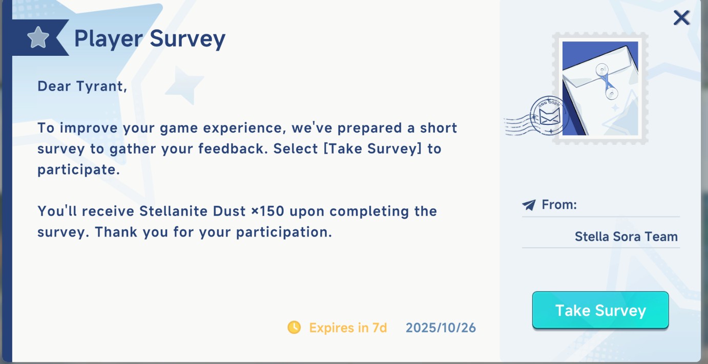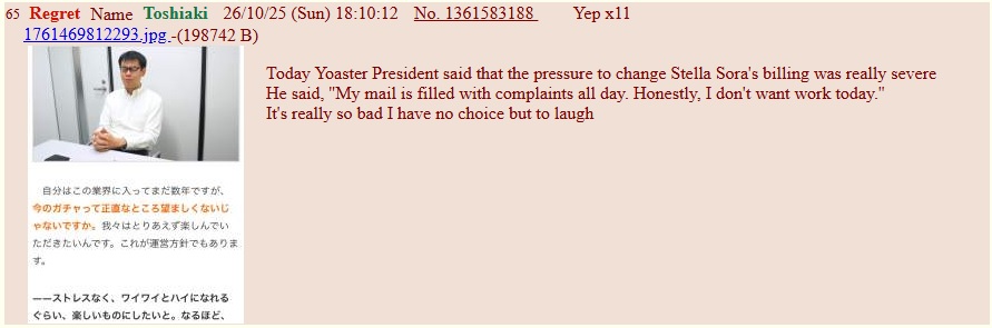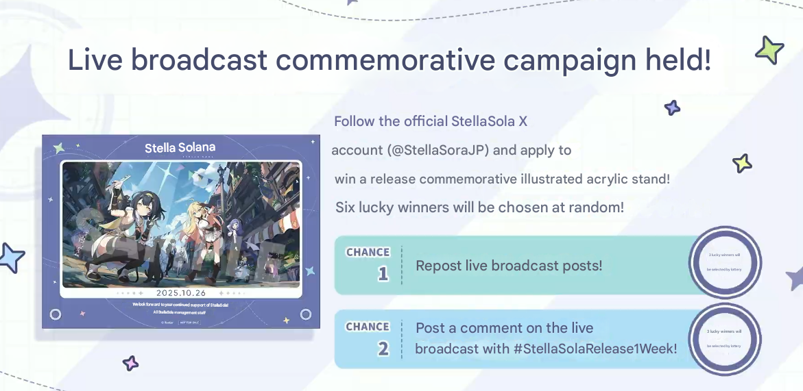 Previous Commission: >>544116716>NEWS: Satisfaction and Feedback SurveyCheck your In-Game mail - Reward 150 gems>First Week LIVE JP Stream:https://www.youtube.com/watch?v=GeYczC8v1EM >NEWS: Yostar's Apologyhttps://x.com/StellaSoraEN/status/1981556407528018040>Game Website & Downloadhttps://stellasora.global/>JP Clienthttps://stellasora.jp/>Current Banner(Aqua) Chitose 5* + (Lux) Jinglin 4* and (Aqua) Teresa 4*>Pre-Release Infohttps://rentry.co/PreReleaseSoraInfo>Day 1 Tierlisthttps://game8.jp/stellasora/729763>/sora/ Friendlisthttps://pastebin.com/sXhz2LgD >Release PVhttps://www.youtube.com/watch?v=zyiEq1_IzdE >CodesBOSSGIFT
