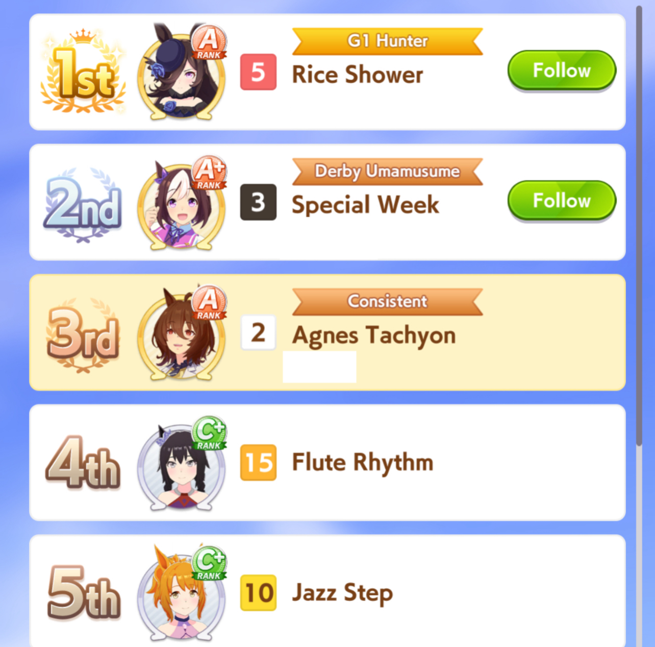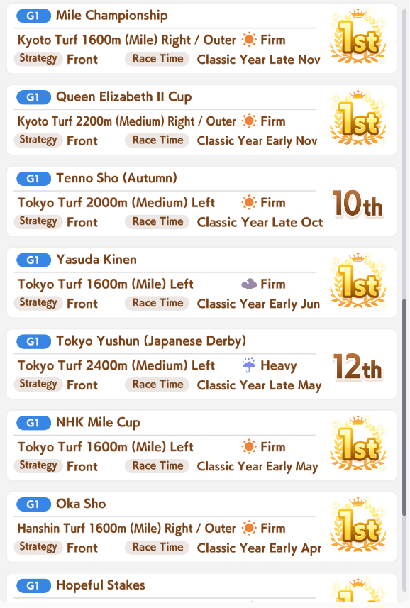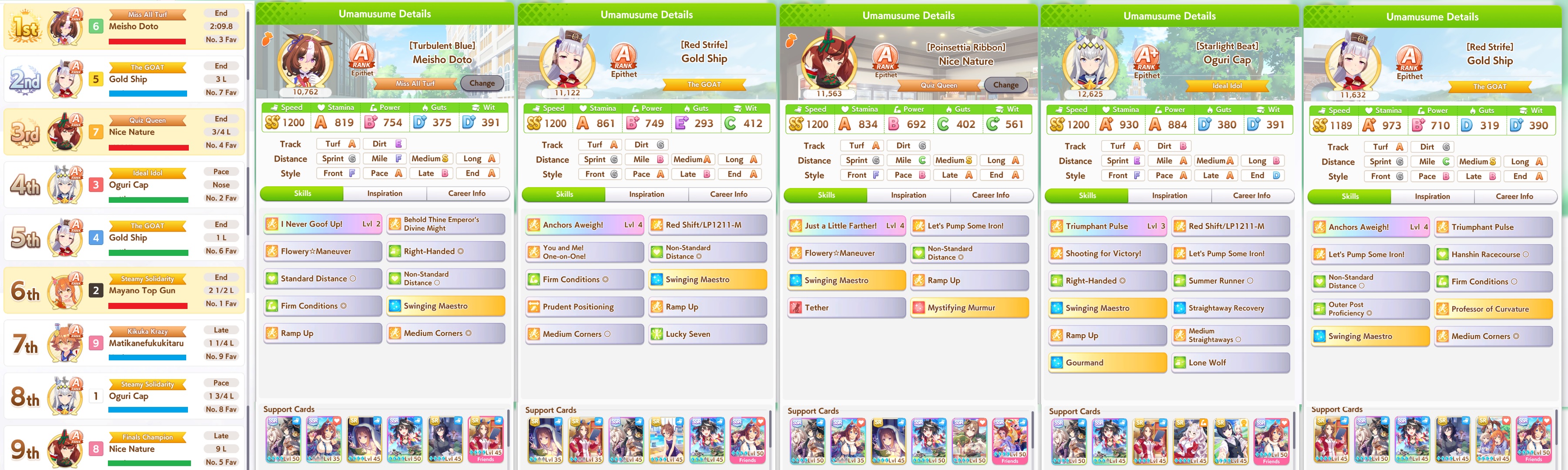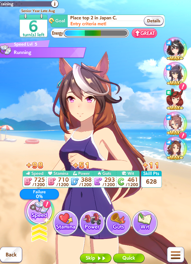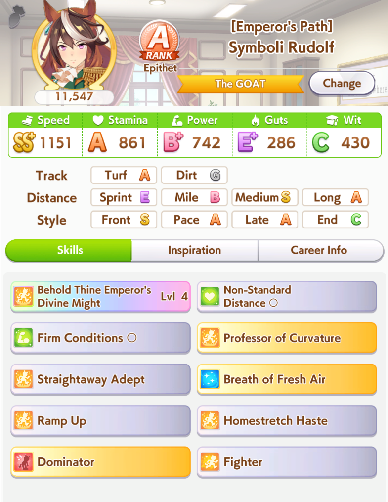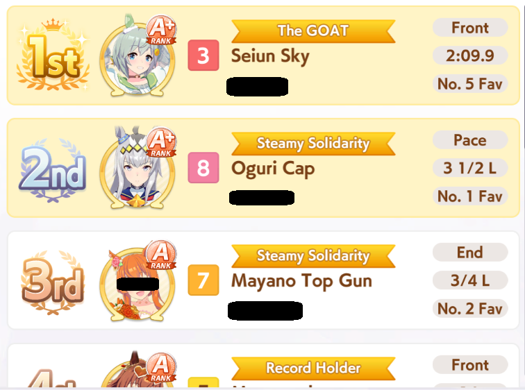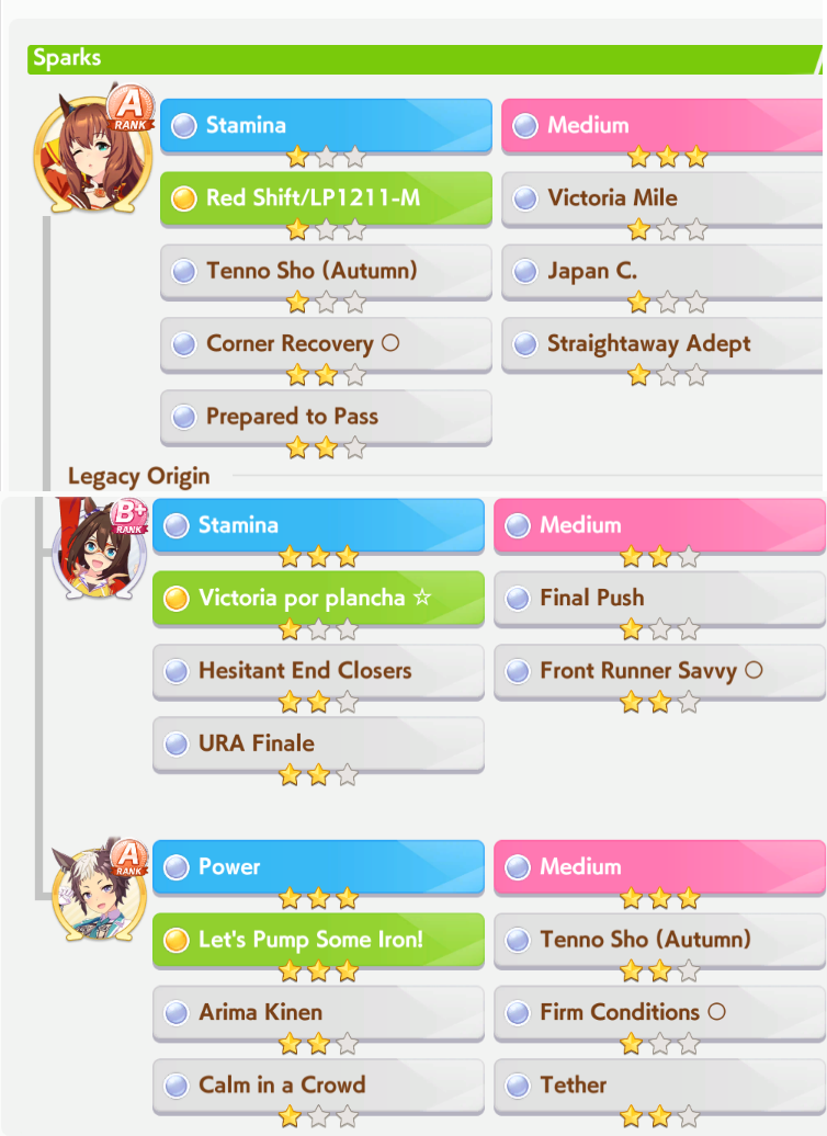 >>544176483run umas with long-centric careers. take stam inherits and run either 3-3 or 2-4 speed-stam cards and stop pressing speed after 700 no matter how good the rainbow is. Some characters have a very bare-bones year 3. Example, Rice Shower's year 3 only has the spring tenno sho, Takarazuka Kinen and the arima kinen, and all 3 can be won at like 500 speed, leaving you free to focus on your stamina.>>544176759true but you'll be at a disadvantage compared to a frontrunner that hits both AXS and redshift.>>544176693this is why i'm bringing a pace chaser daiwa that is pretending to be a frontrunner with Groundwork and Angling + Redshift. If there's no frontrunner, I'm giving her all the tools she needs to take lucky pace by force. If they build their frontrunners poorly, she's got a chance to Daiwa rocket off them. If the fronts are competetive either my late/end do the work or I just lose.